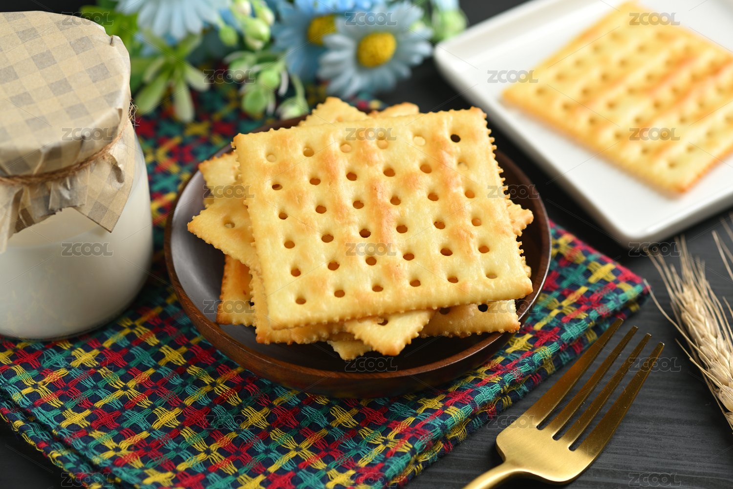 一盘芝士夹心饼干摆放在木桌面上特写深色调