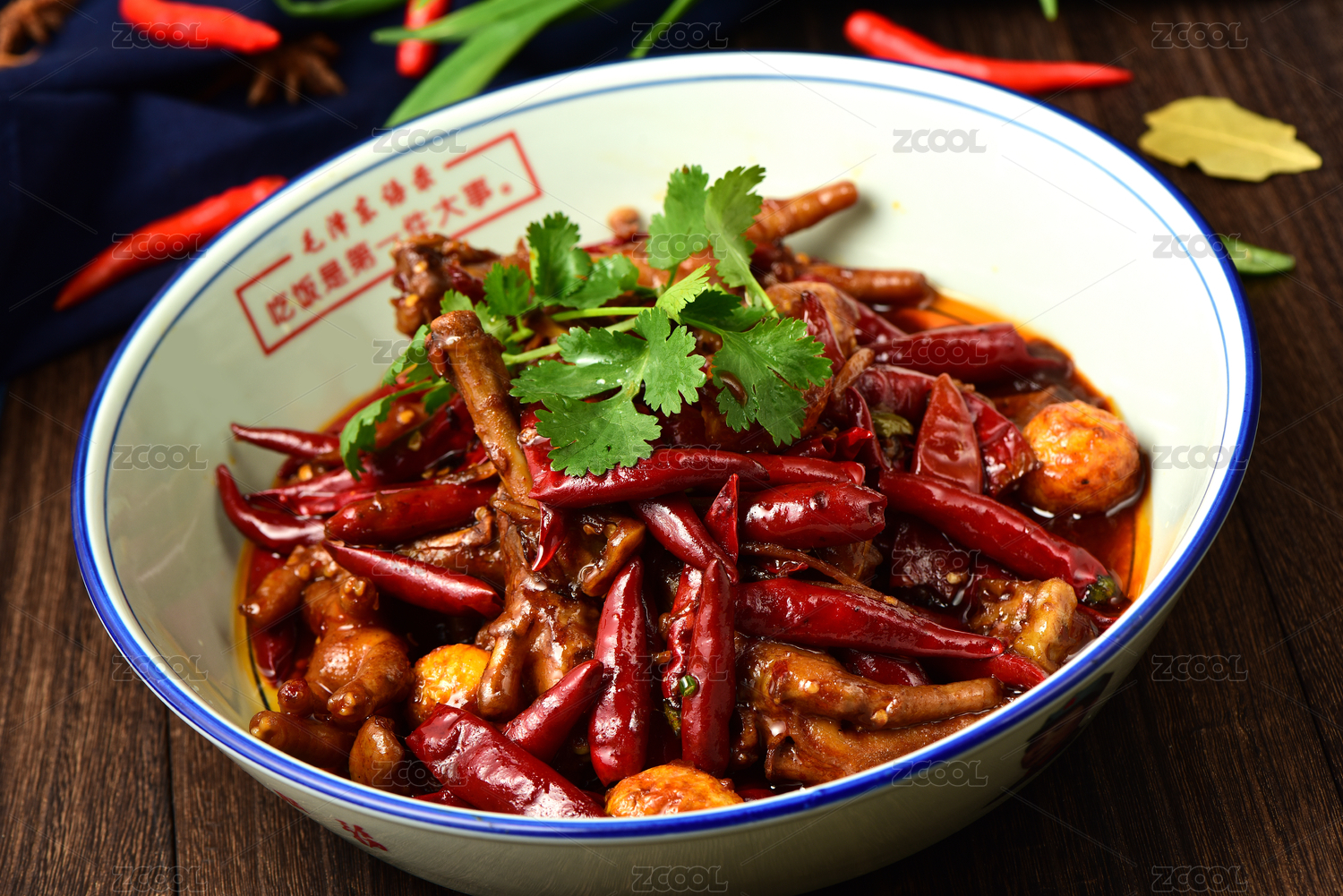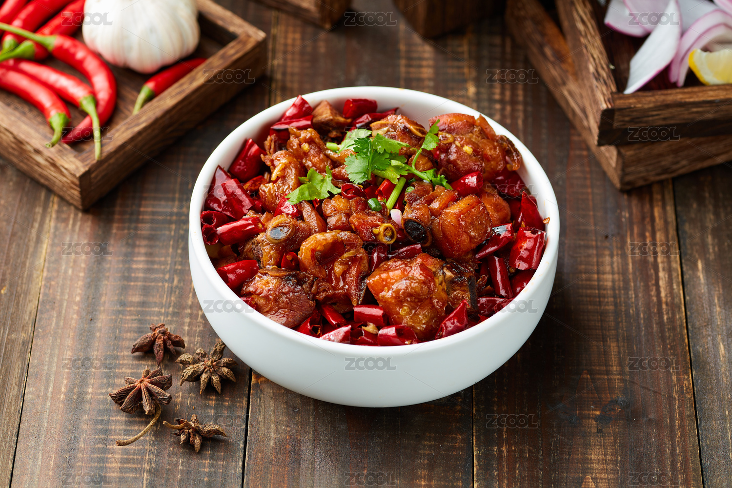 木桌面上白色盘子上装着一盘香辣牛蛙