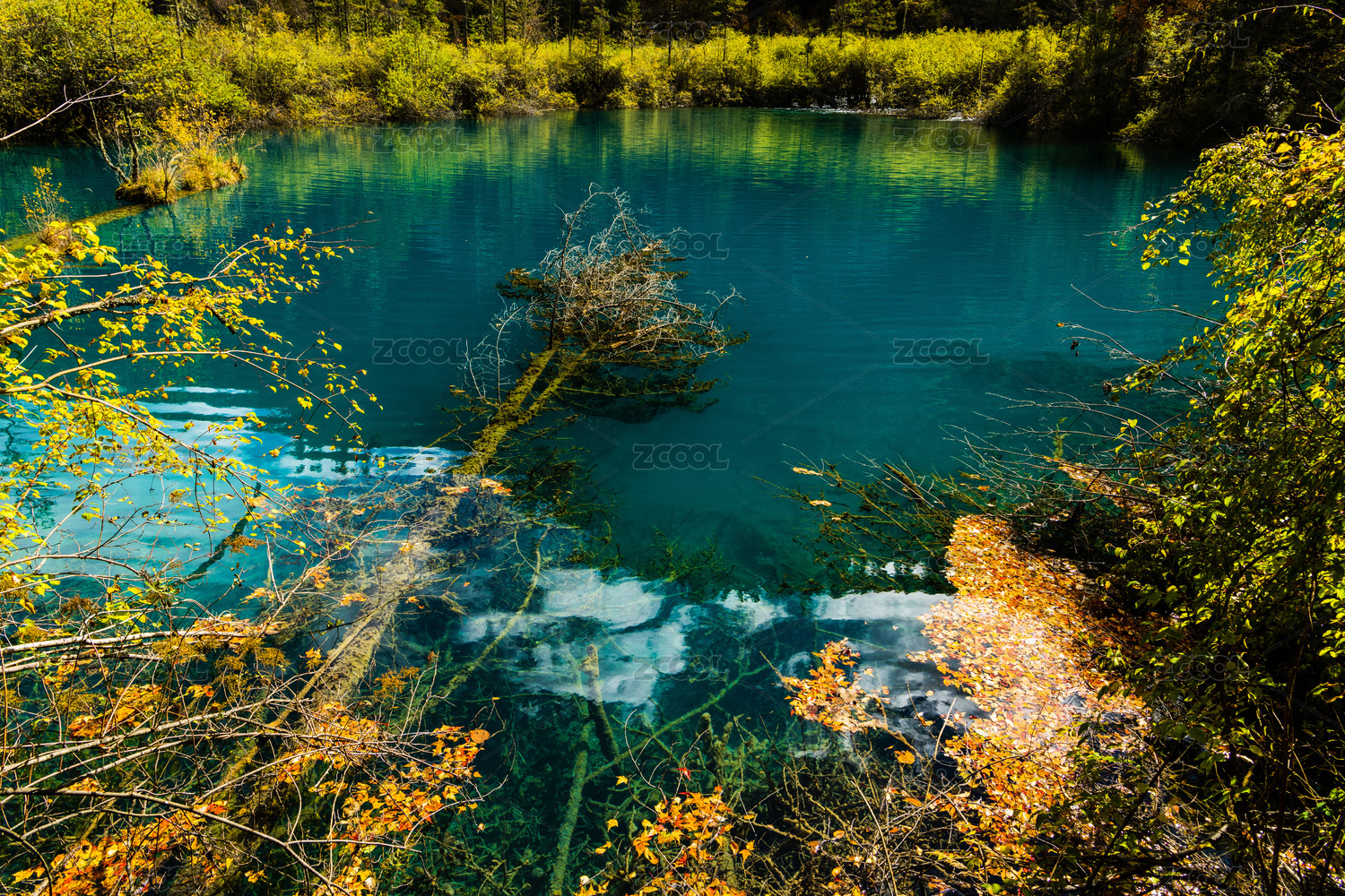 中国四川九寨沟金铃海澄澈的幽蓝的湖水和金色的灌木