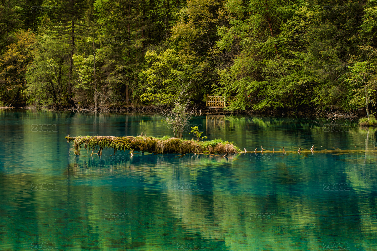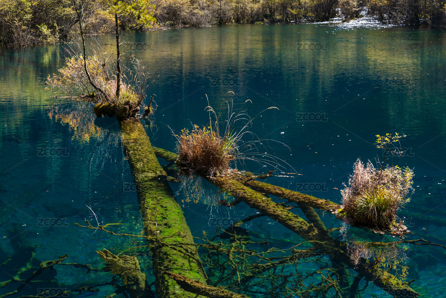 九寨沟箭竹海秋色,长满植物的枯木水面倒影