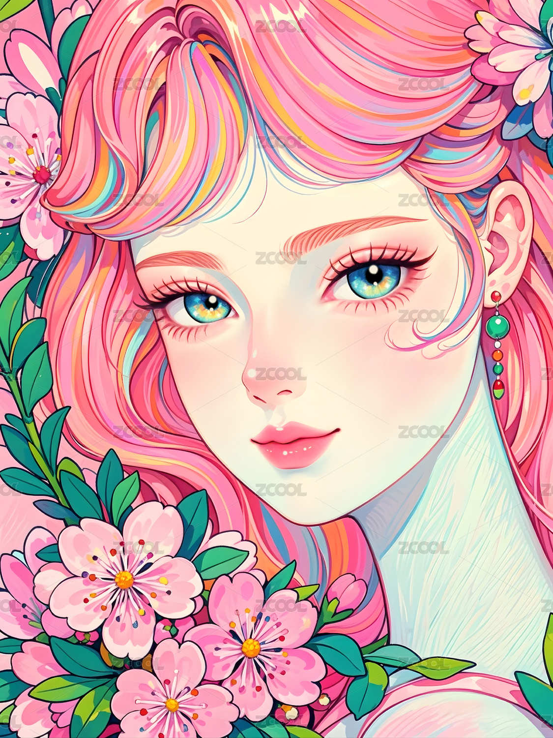 梦幻,长发,漂亮,可爱,花朵,清新,唯美,艺术,插画,绘画