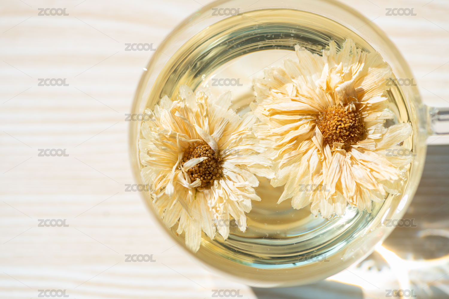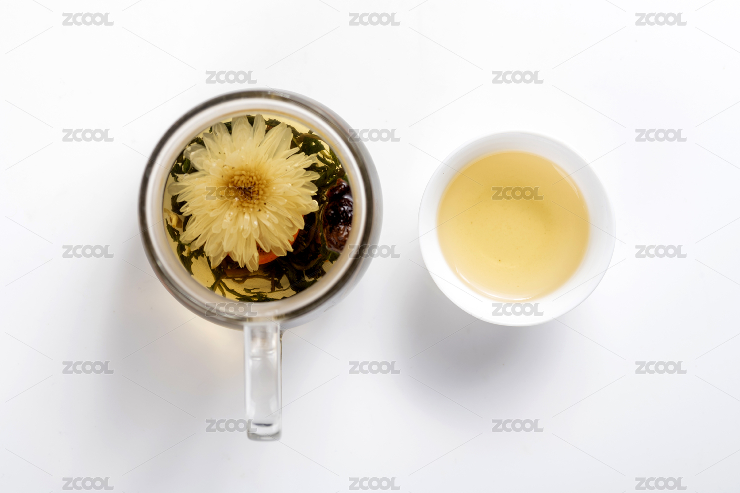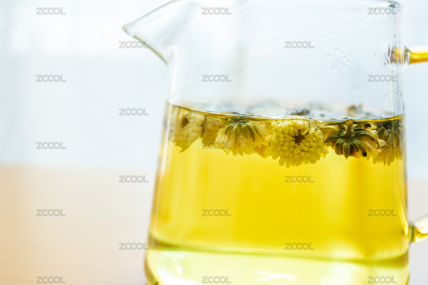 白色桌面上玻璃杯装着的菊花茶
