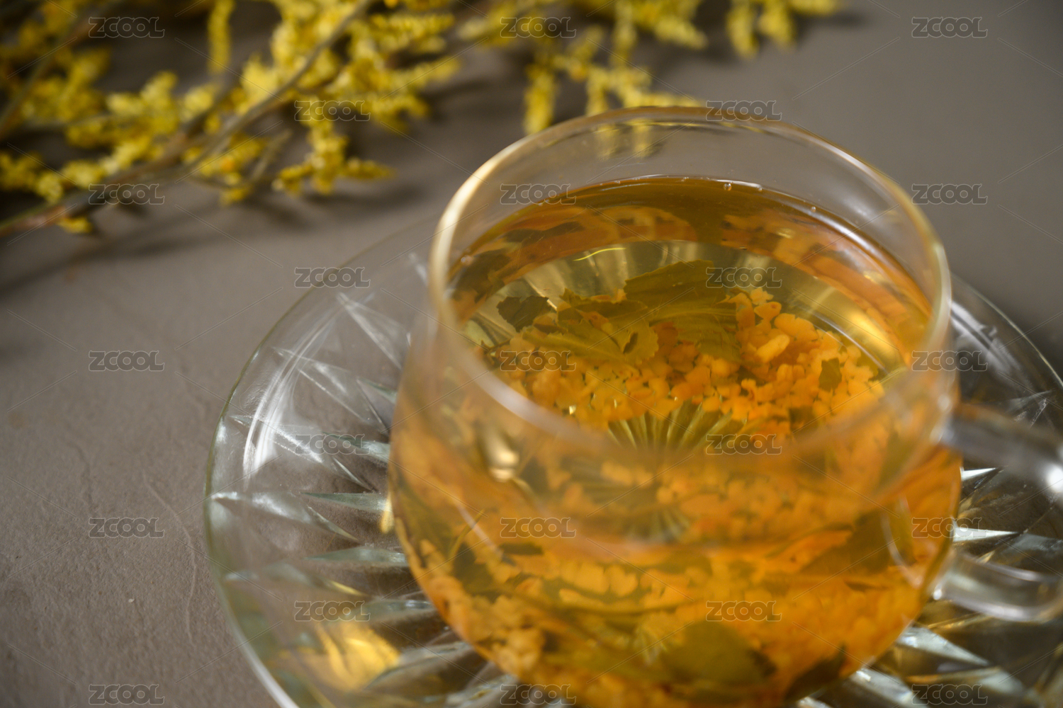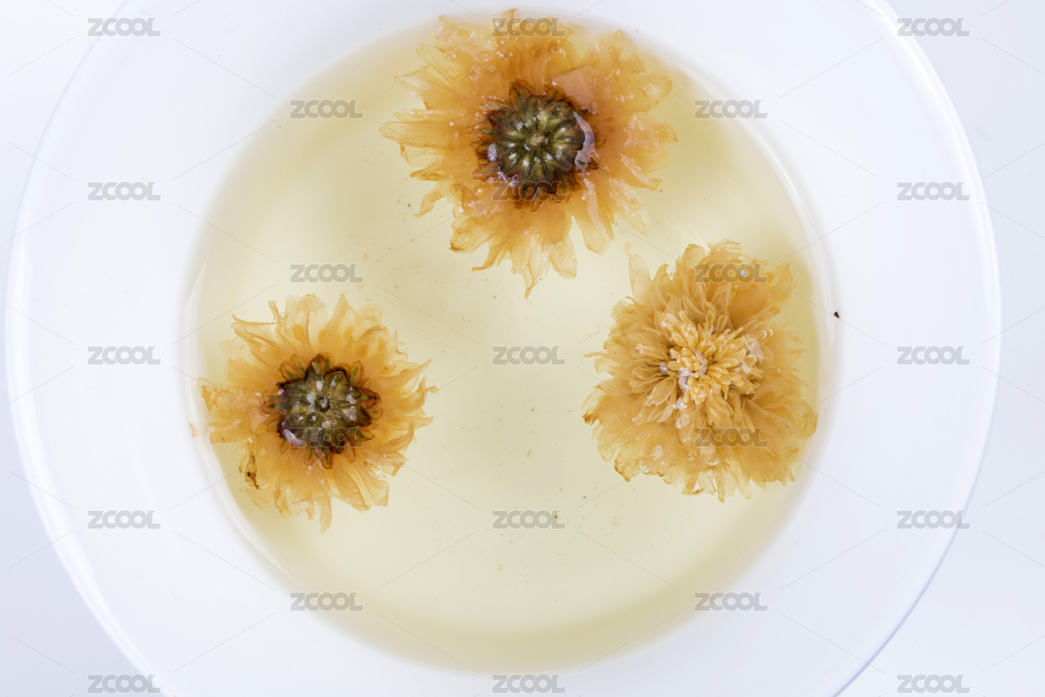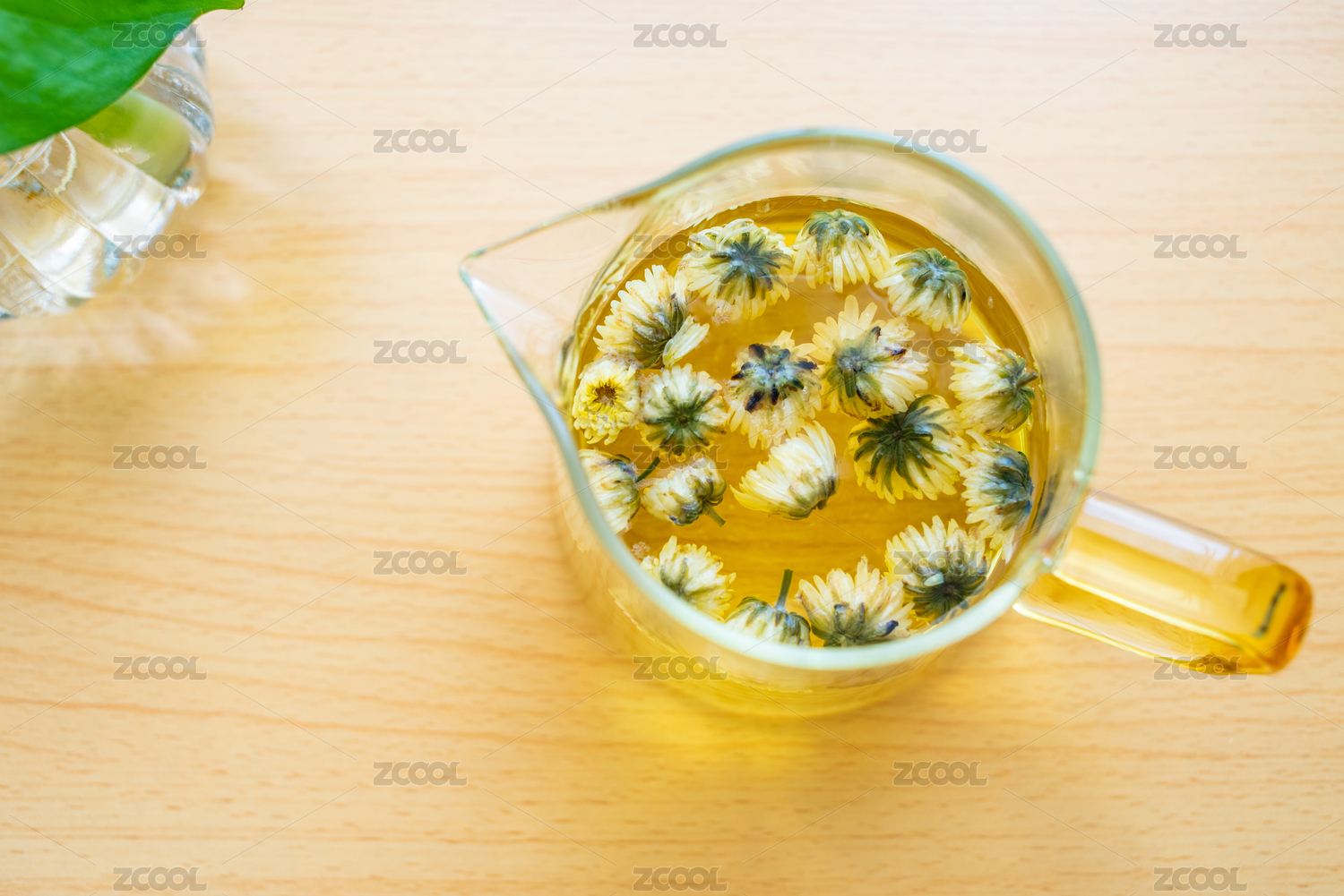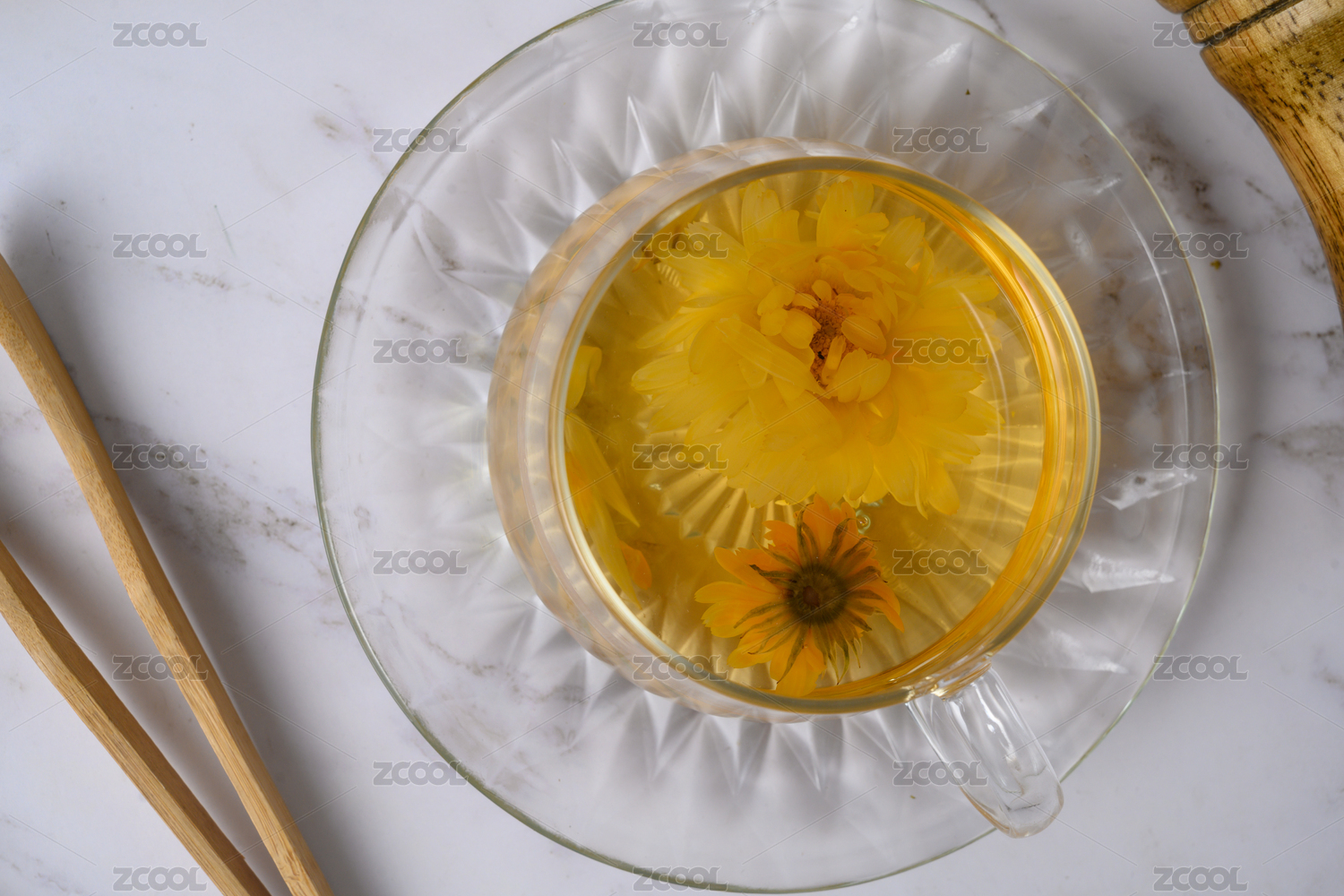白色桌面上玻璃杯装着的菊花茶