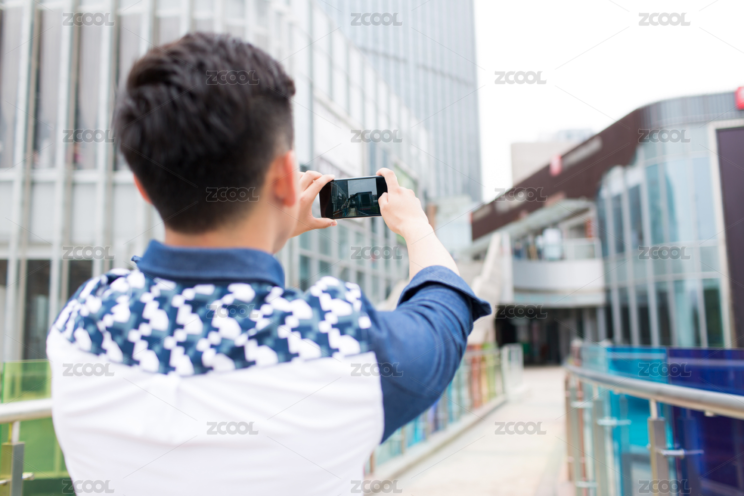 年轻男子在城市商业区,使用移动电话拍照
