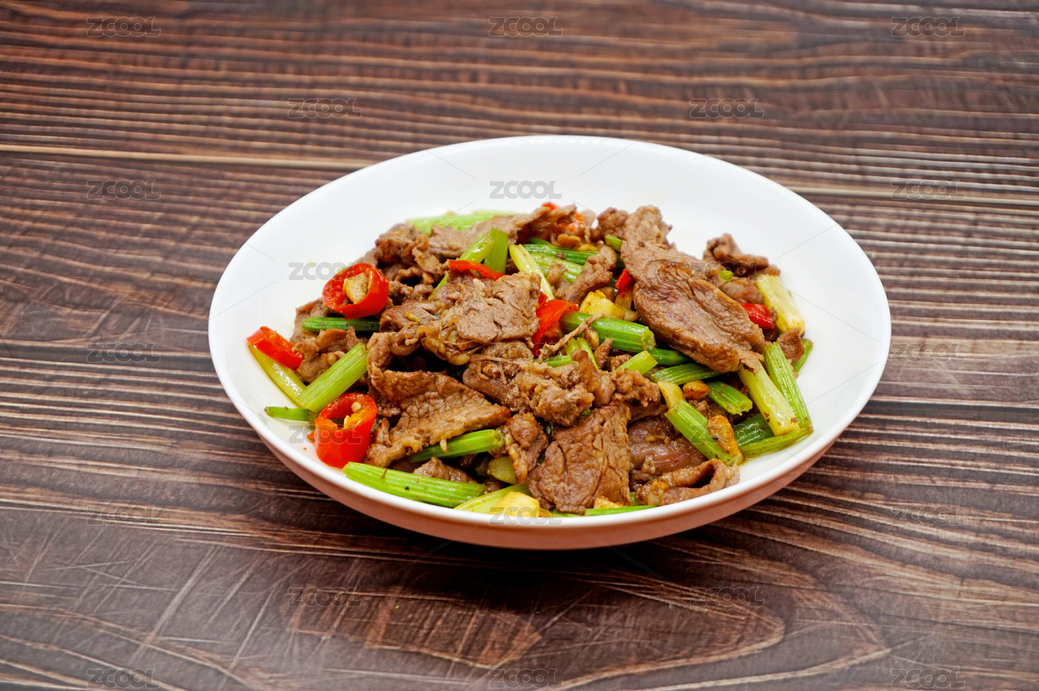木桌背景中的一盘芹菜炒牛肉小炒黄牛肉