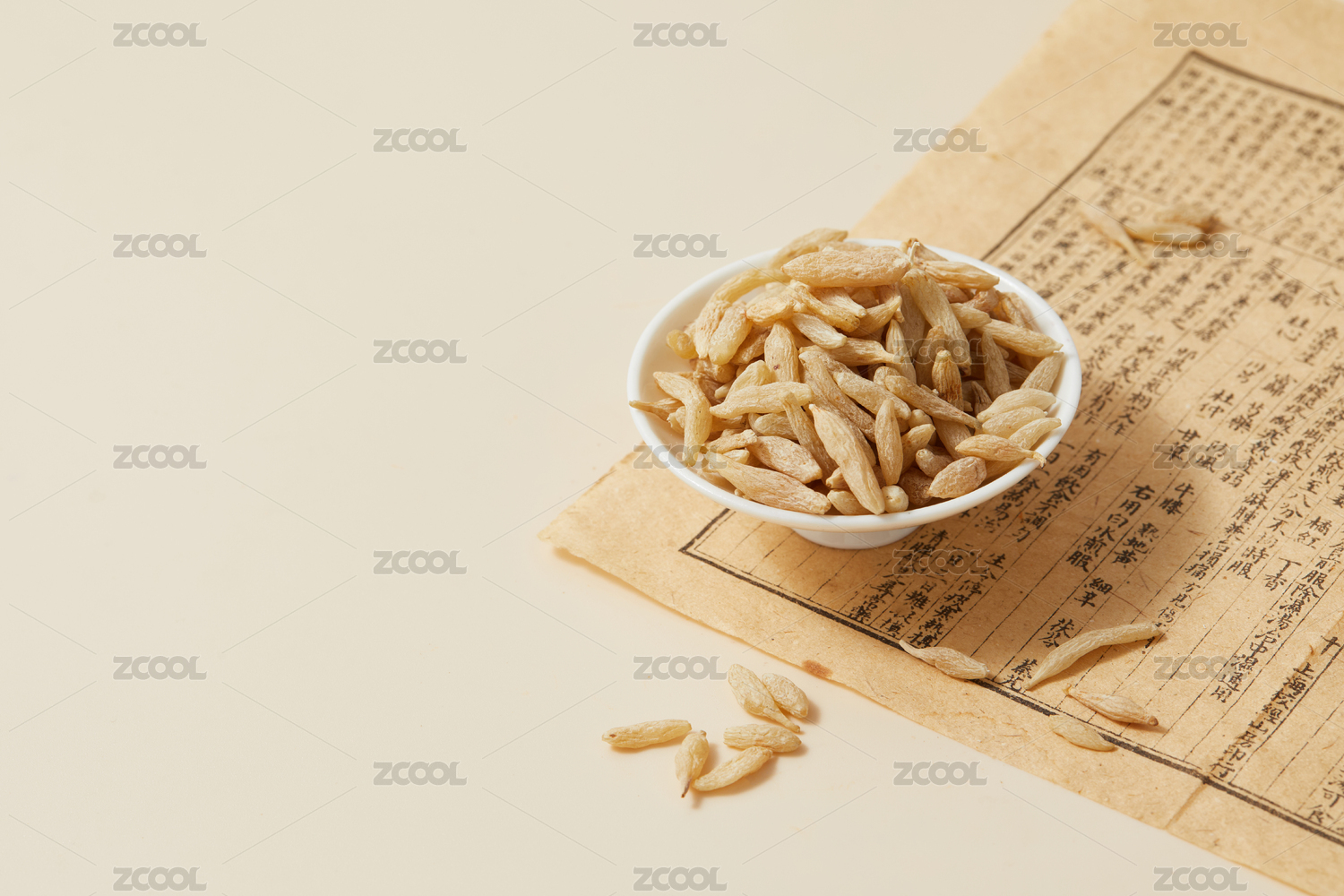 黄色背景古书上的中药材麦冬