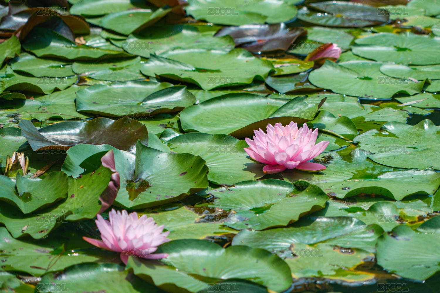 夏天池塘里绿色叶子中间盛开的粉红色的睡莲花