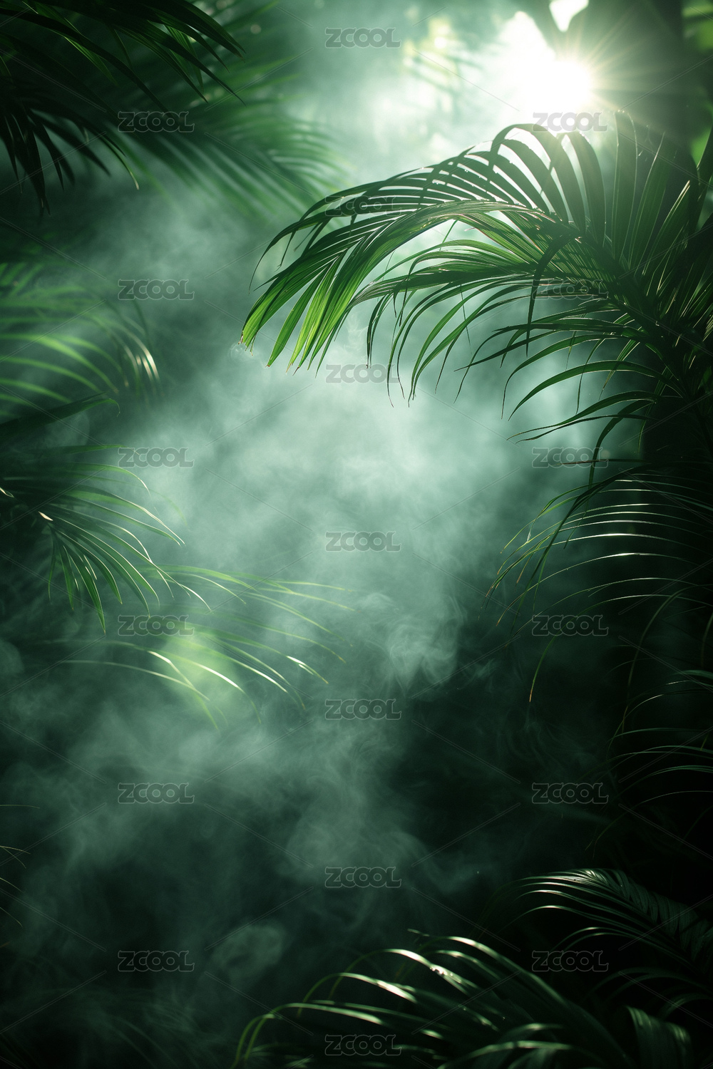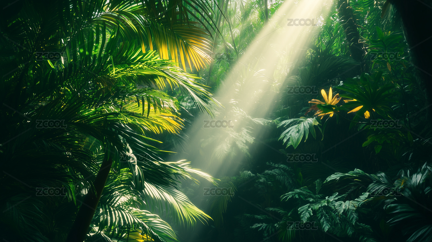 郁郁葱葱的热带雨林阳光穿过树叶照射进来