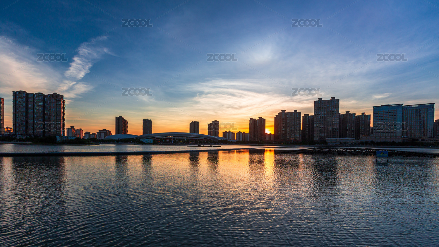 河南省日落十分小城市晚霞城市倒影