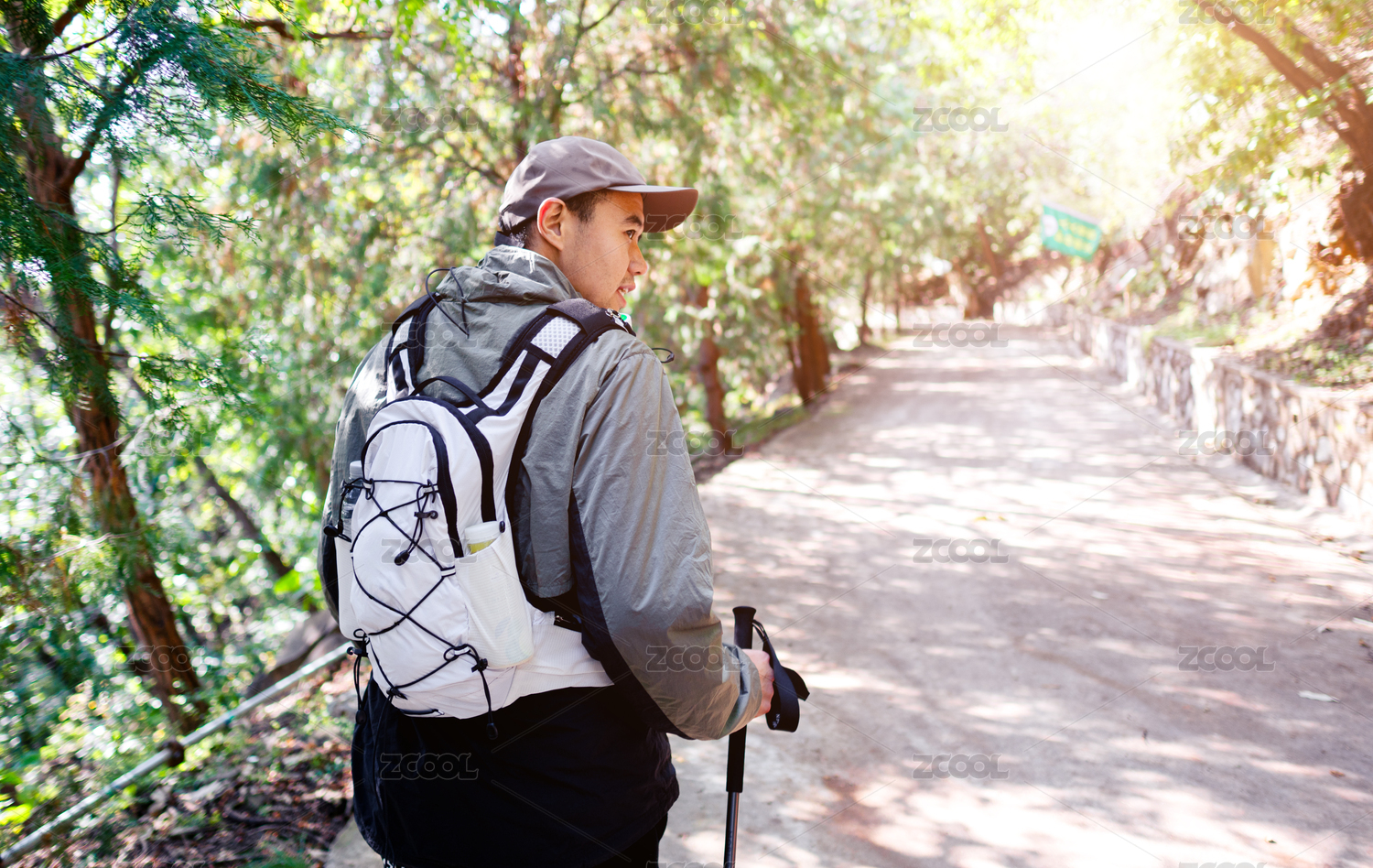 背部的纵向视图亚洲中国的黑发女孩享受夏末背包林路道路和新鲜的空气。