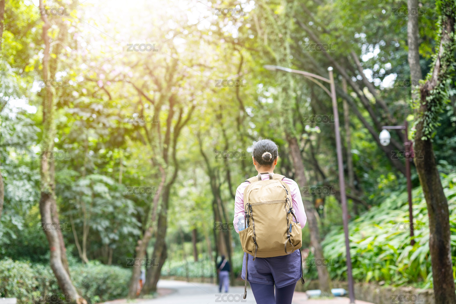 后视图的优雅美丽的女性旅客去国家公园徒步旅行和徒步森林道路上享受暑假的照片。