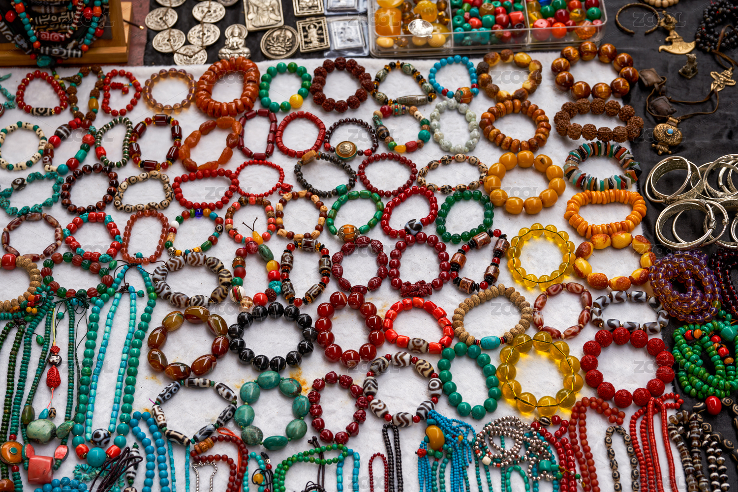 市场上售卖的各种彩色宝石手镯和手环特写