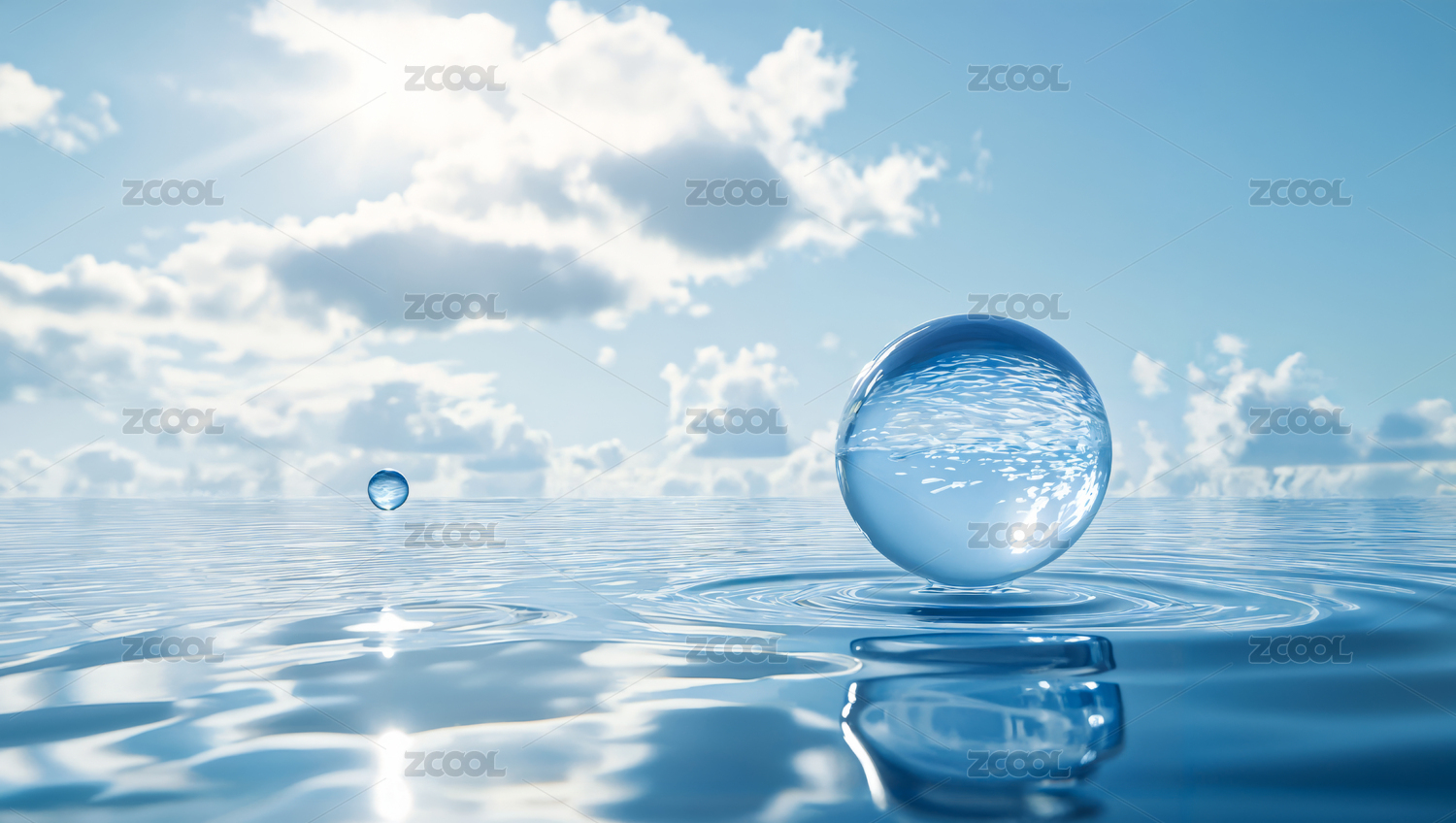 蓝色液体球体与水面涟漪