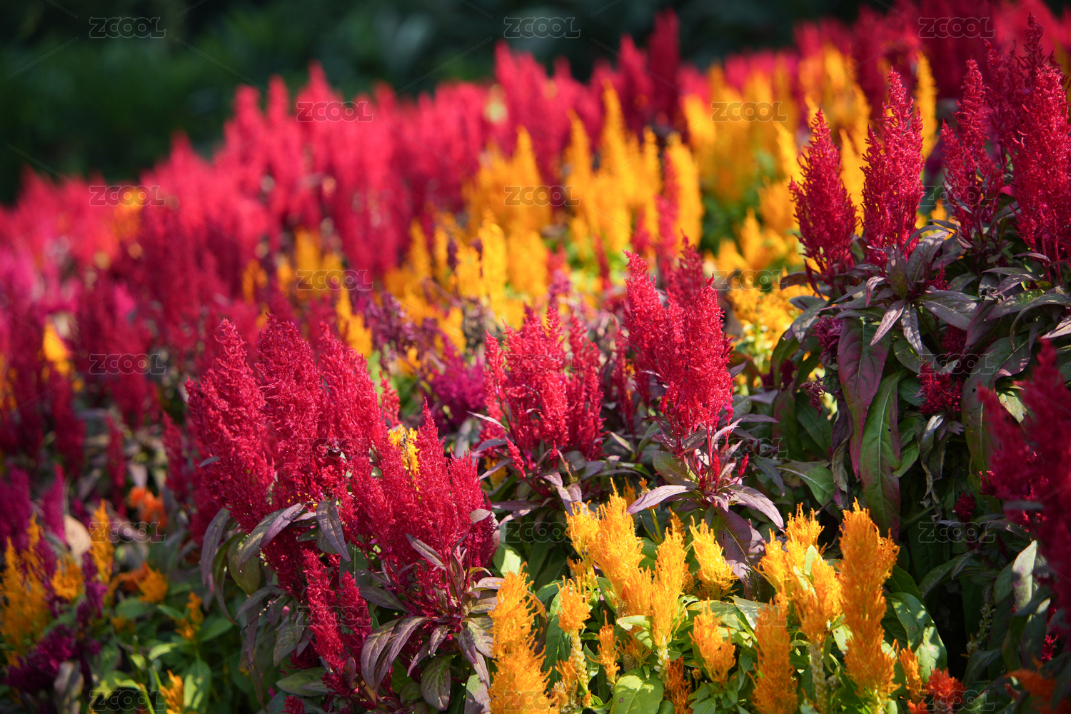 花圃里兰猪耳花和鸡冠花交织成一条对角线