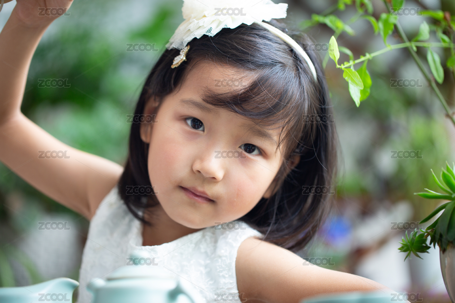 小女孩身穿白色礼服,头戴花朵装饰