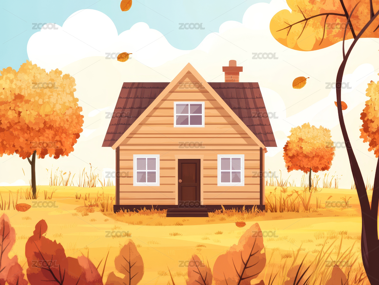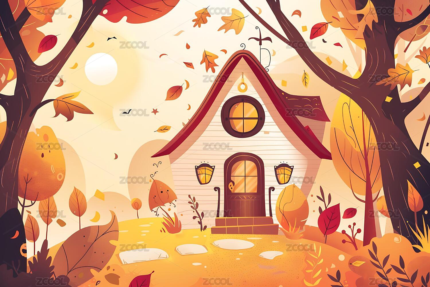 秋分节气户外房屋落叶处暑时节秋日场景插画