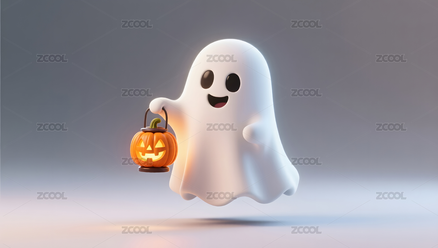 万圣节可爱幽灵提着南瓜灯的3D插画