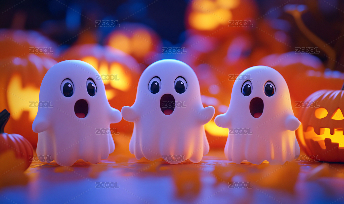 3D卡通可爱幽灵和南瓜的万圣节背景