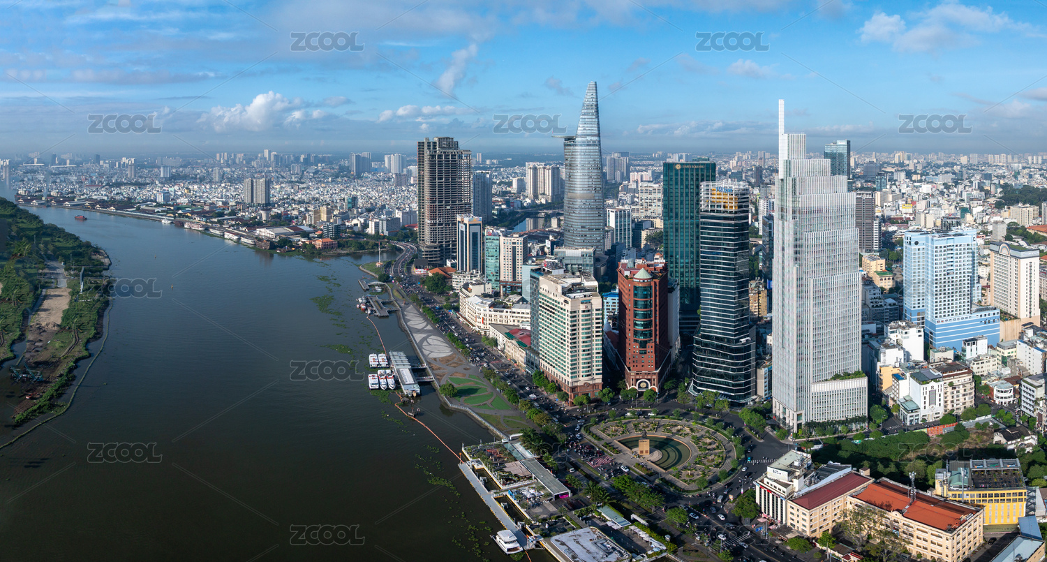 越南胡志明市西贡河城市高楼天际线风光航拍
