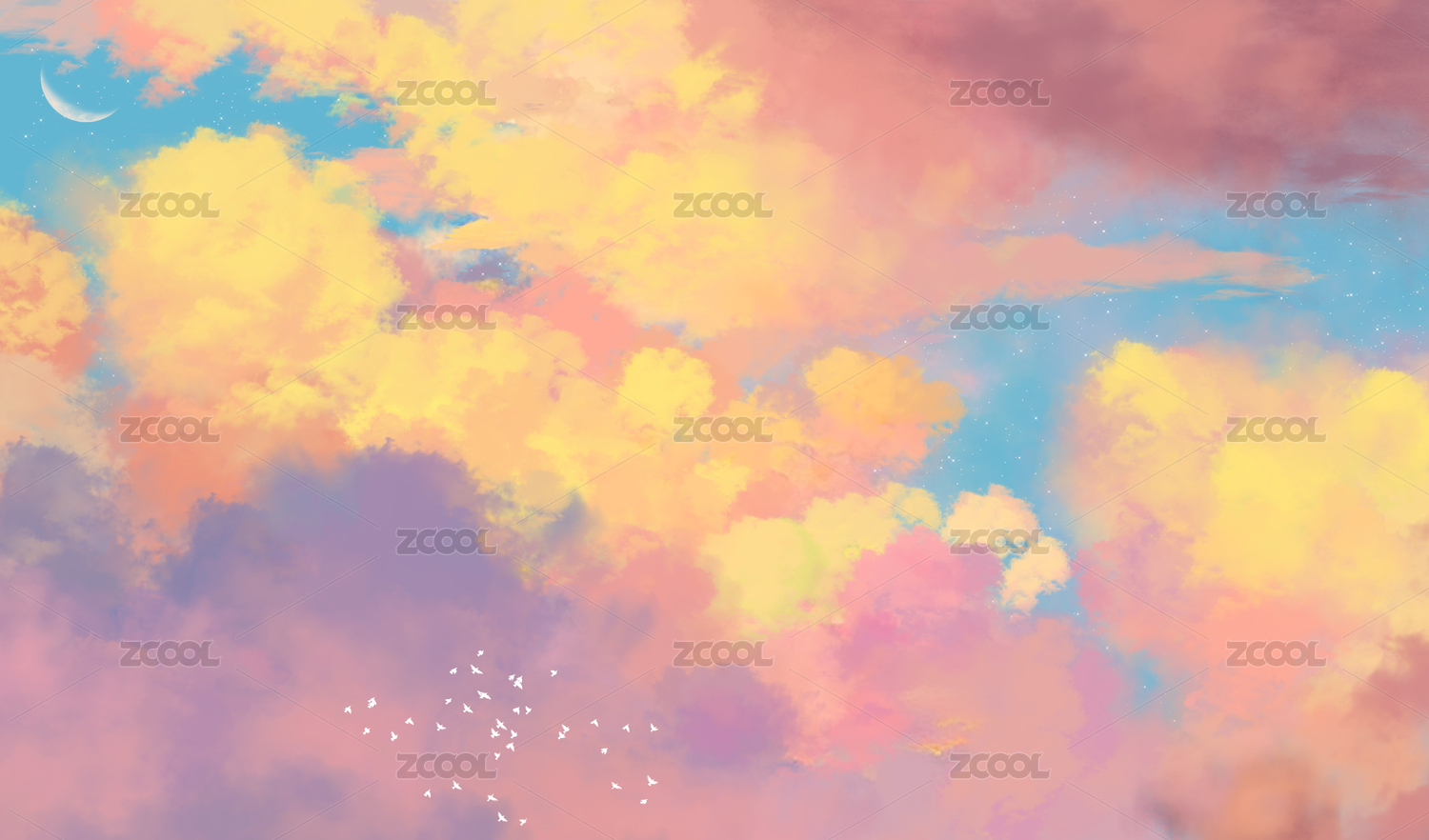 梦幻治愈云层插画,夏天唯美天空云彩风景插