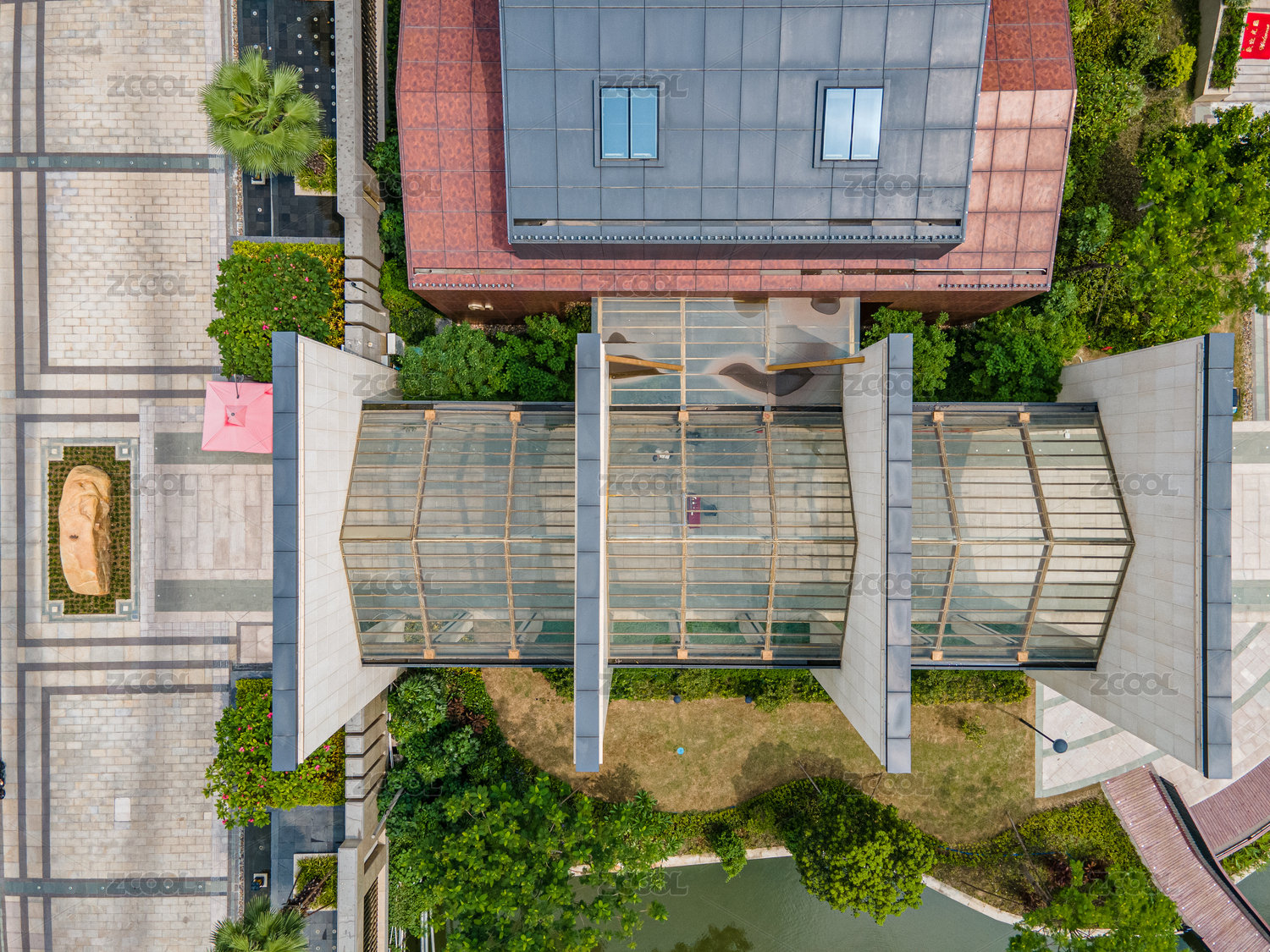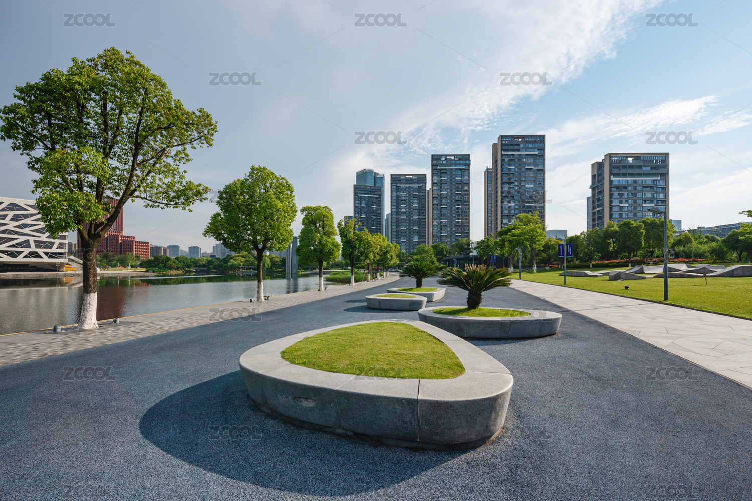 建筑的玻璃幕墙倒映着远处的蓝天和绿树
