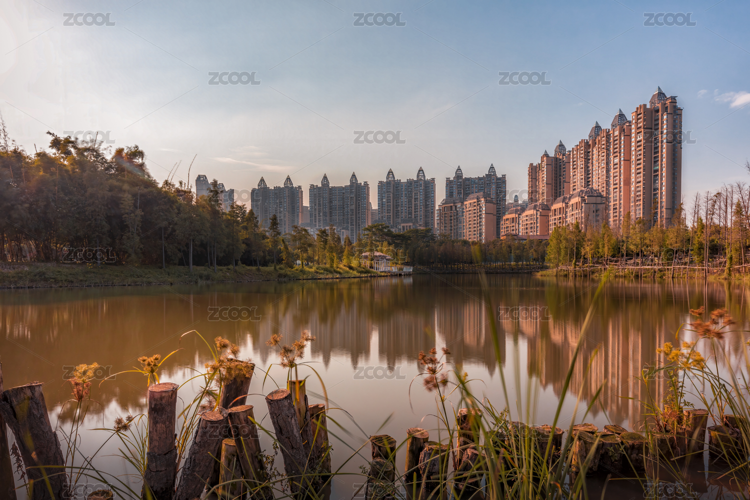 南宁南湖公园夕阳黄昏与城市摩天大楼建筑