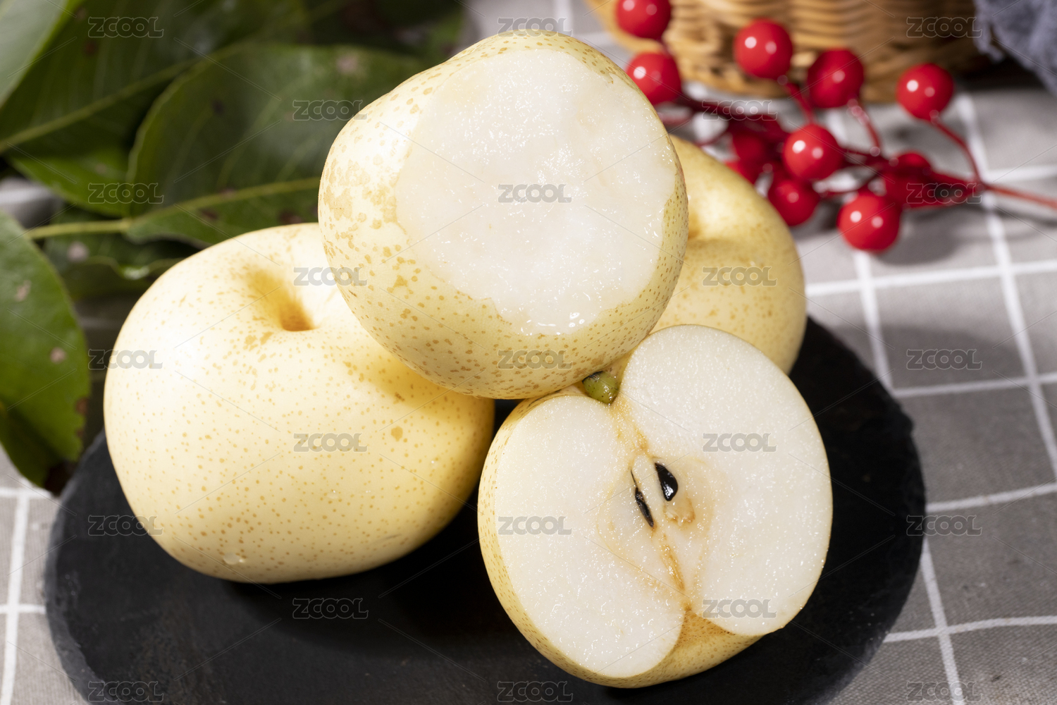 黑底盘子里放着一个完整的皇冠梨和半边雪梨