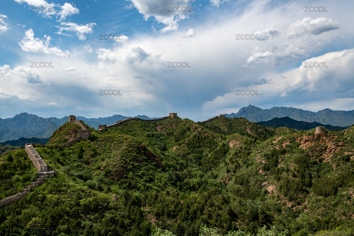 蓝天白云下的中国长城蜿蜒盘旋丛山峻岭
