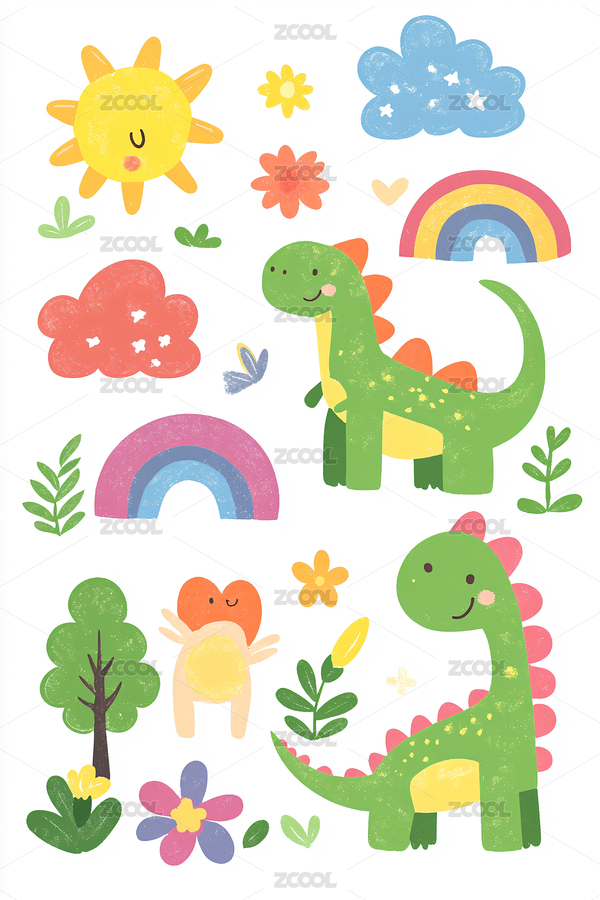 卡通,贴纸,儿童,可爱,恐龙,树,太阳,彩虹,花朵,可爱元素