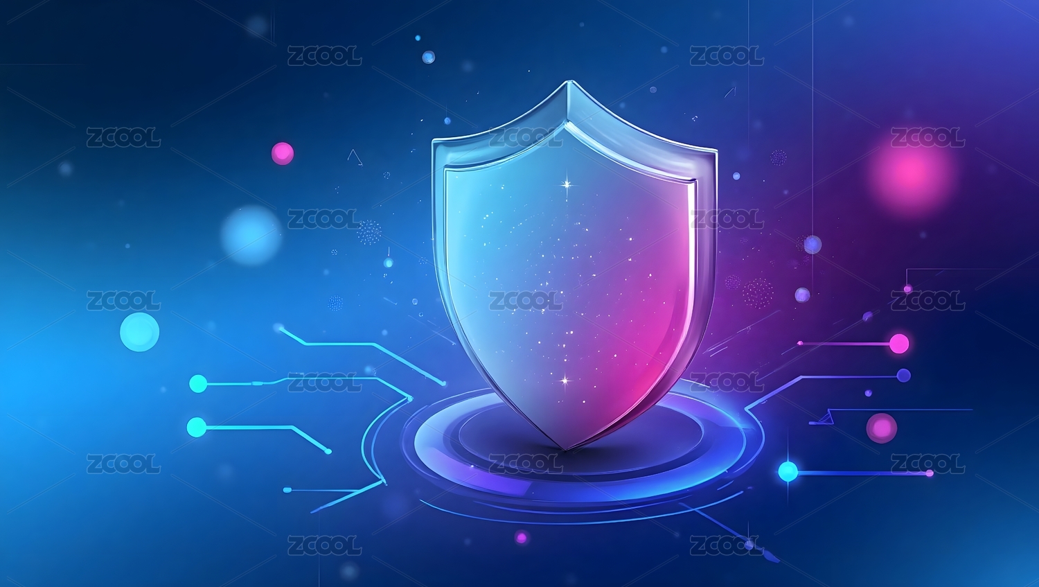 一个紫色的盾牌图标在抽象背景上散发着能量