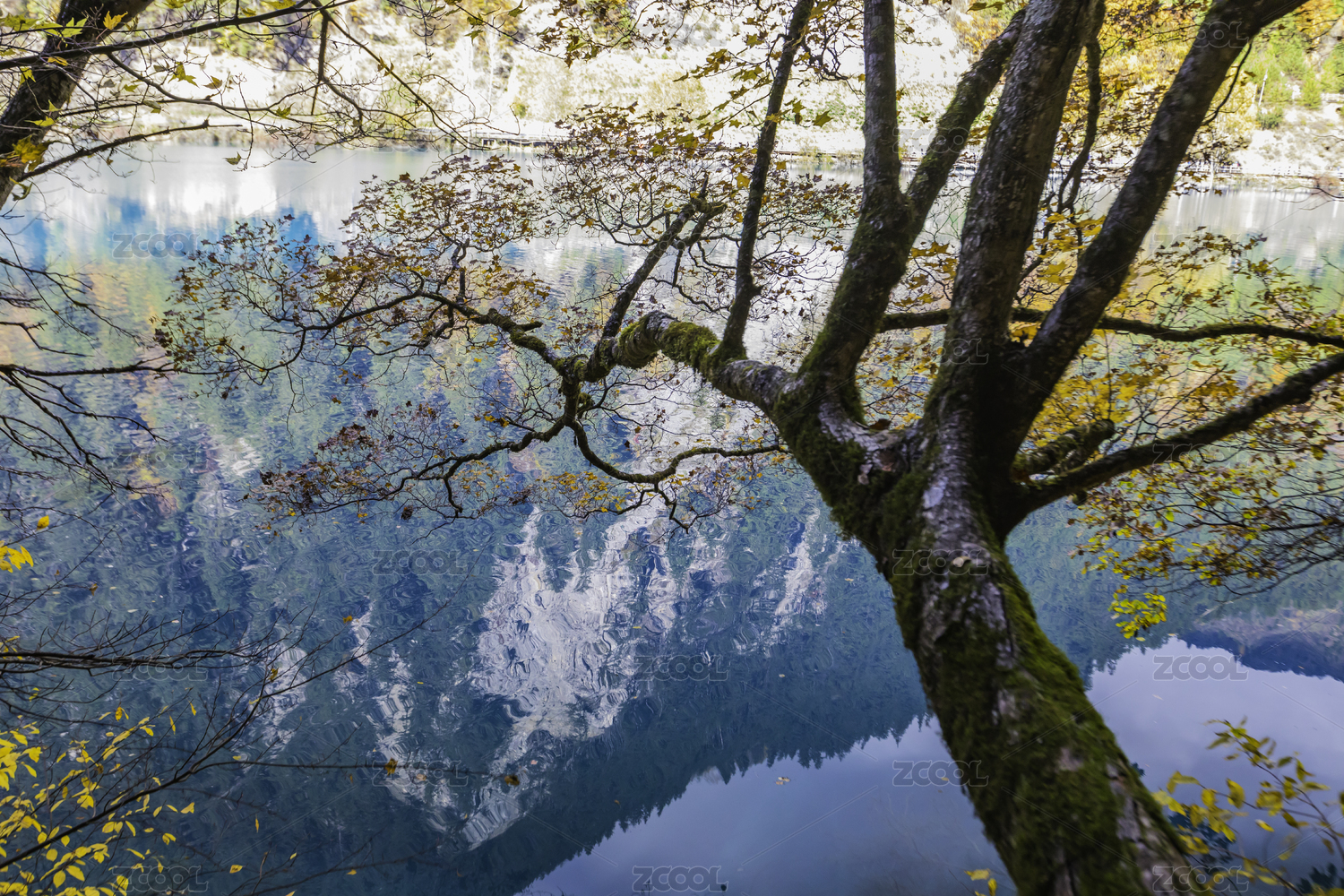 中国四川省阿坝州九寨沟风景区-蓝色湖水边的绿色枝叶和倒影