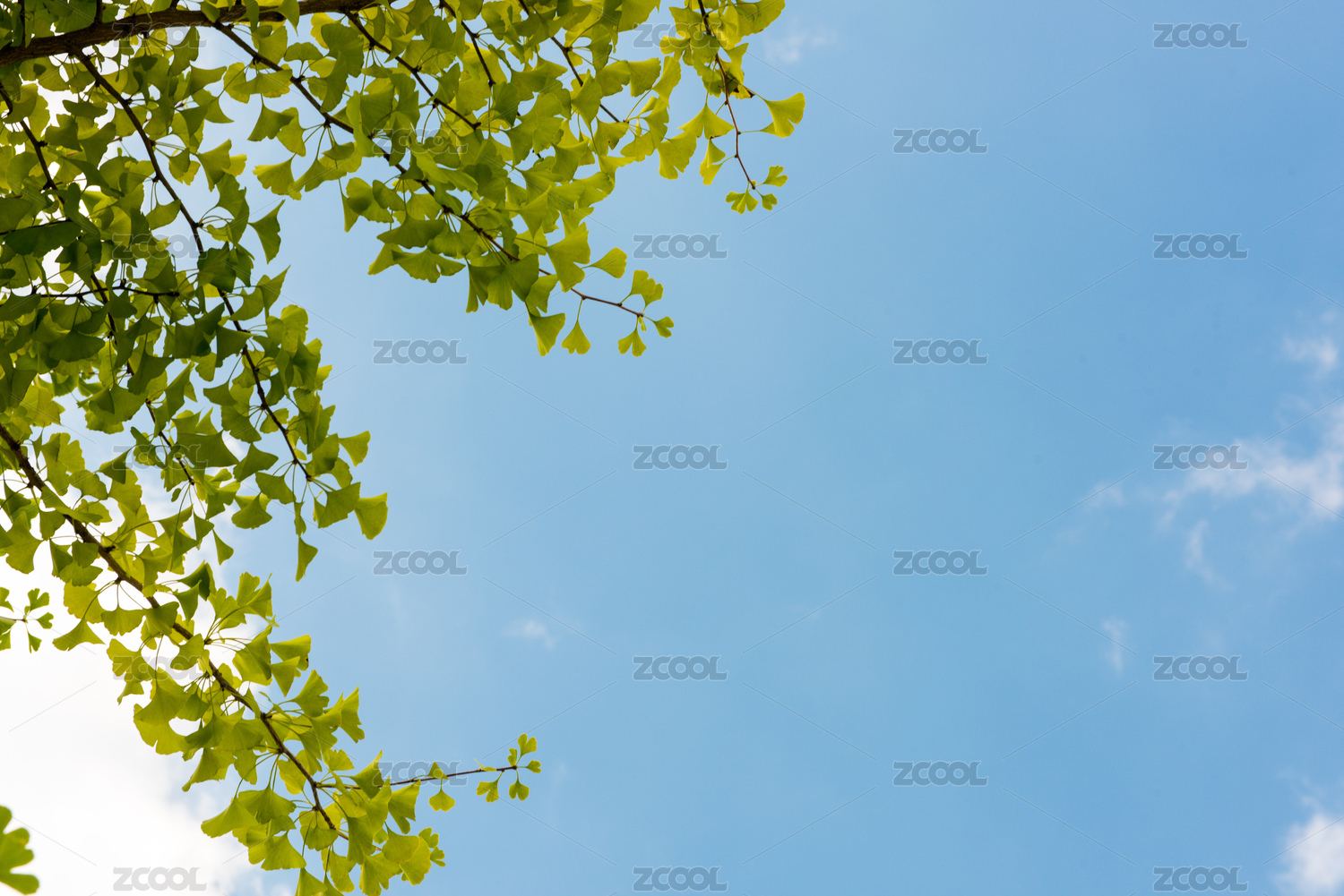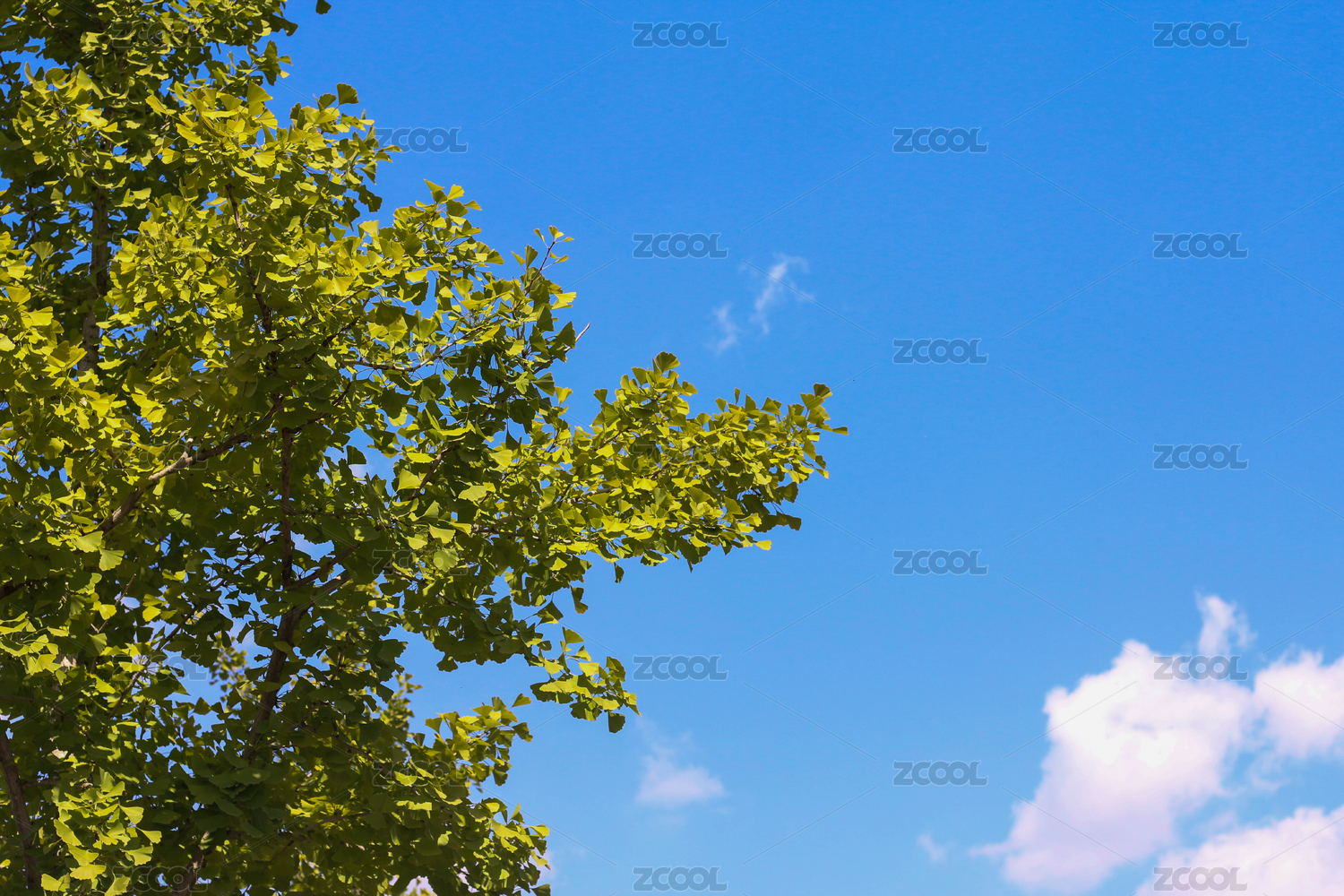 晴朗的蓝天白云映衬下的银杏树