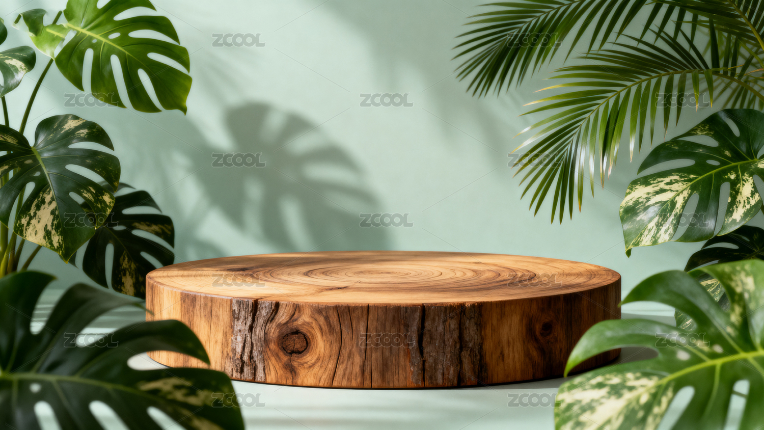 悬浮木台与绿植背景