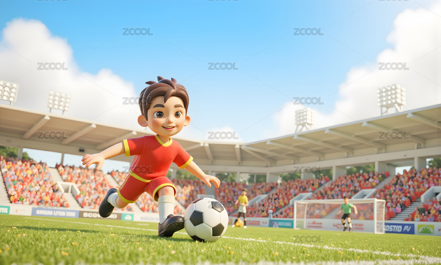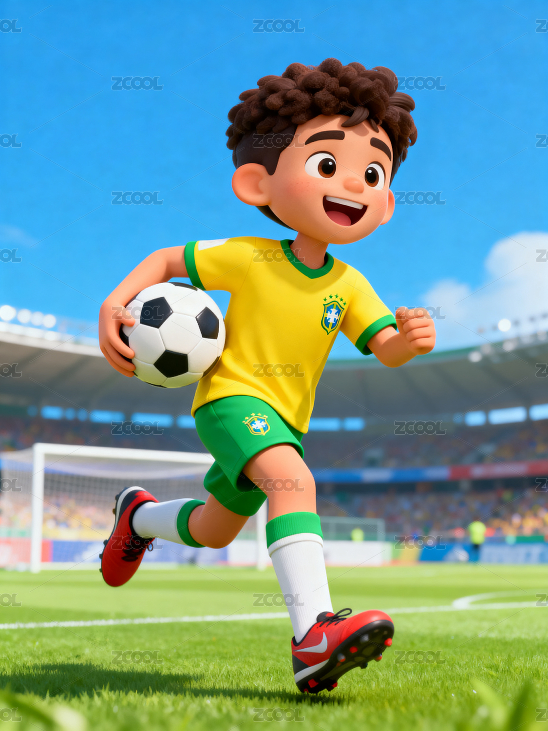 踢球,运动,快乐,小男孩,棕色皮肤,卷发,黑黄足球短裤,草地,动画风格,皮克斯