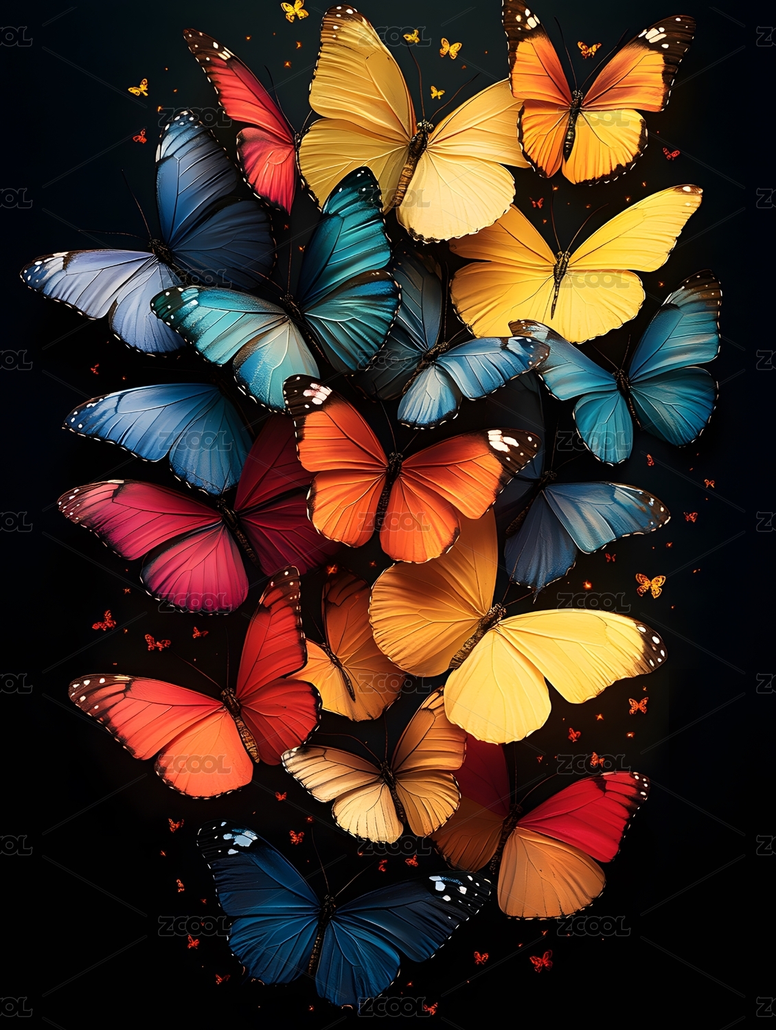 五彩斑斓蝴蝶于梦幻蓝绿背景飞舞