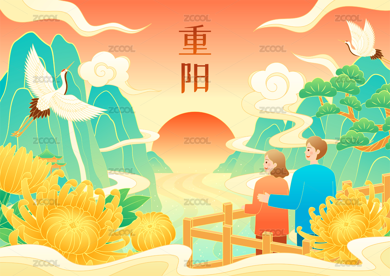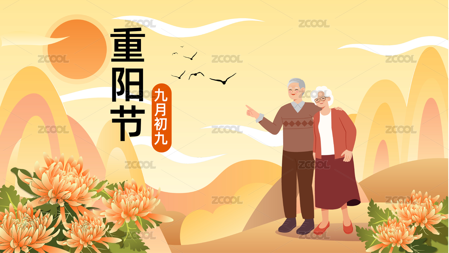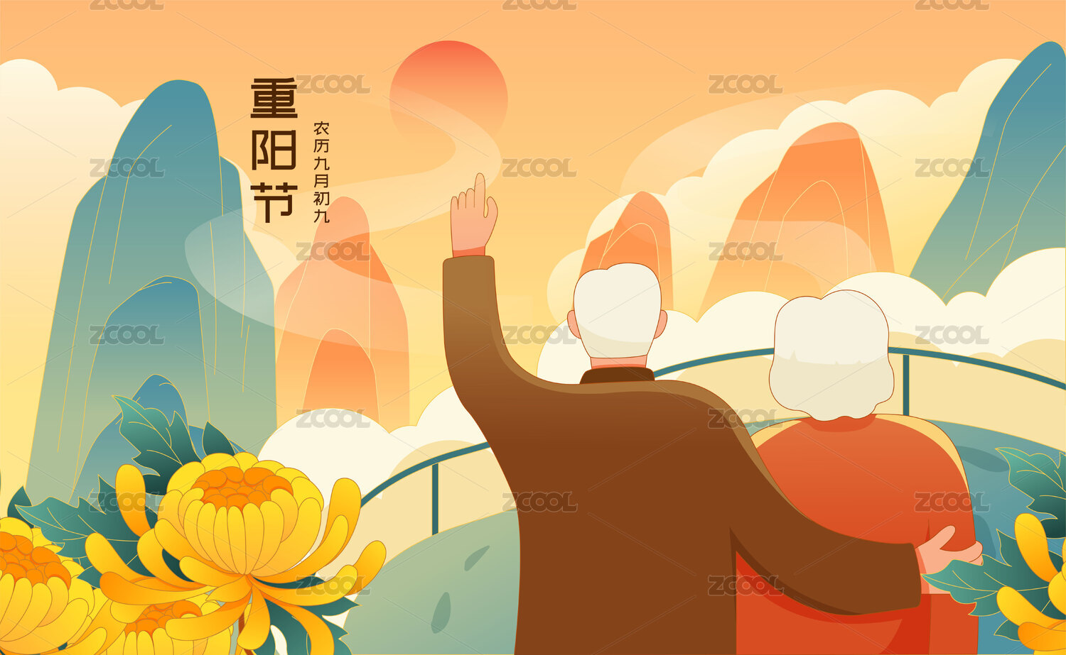 重阳节老年夫妻登高望远登山赏菊节日插画