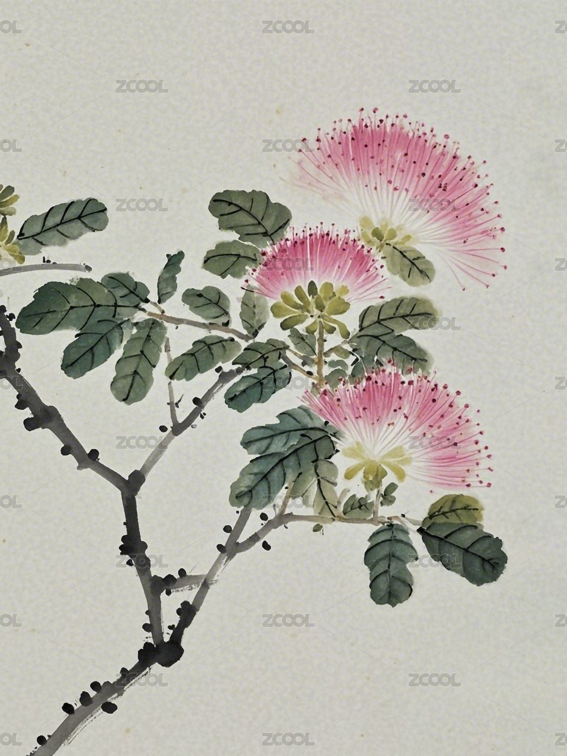 中国古典水墨画风格的粉色合欢花枝干