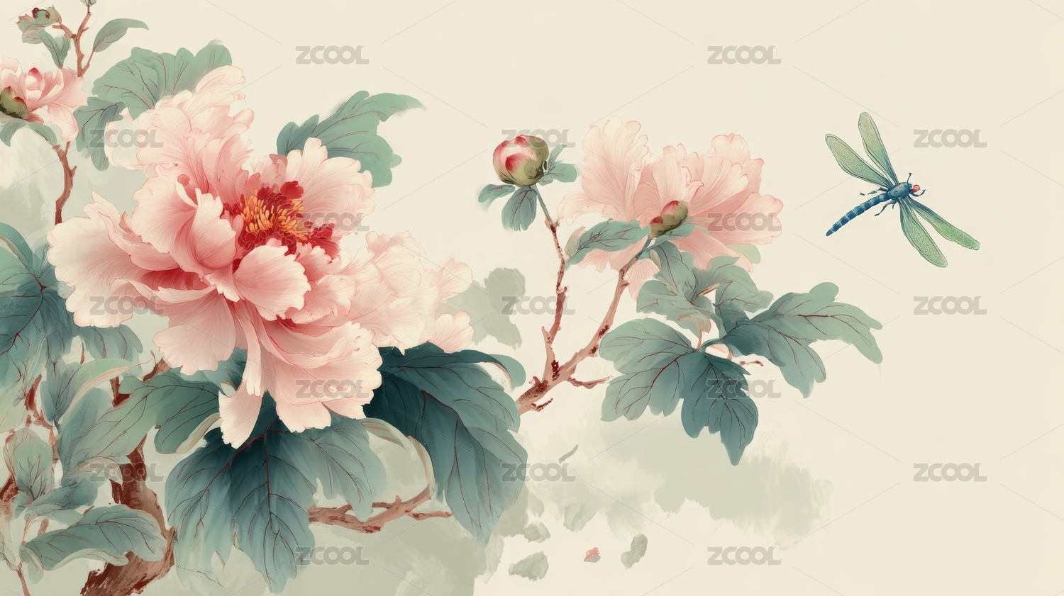 牡丹,蝴蝶,粉色,盛开,飞翔,美丽,淡雅,山水画,中国画,传统