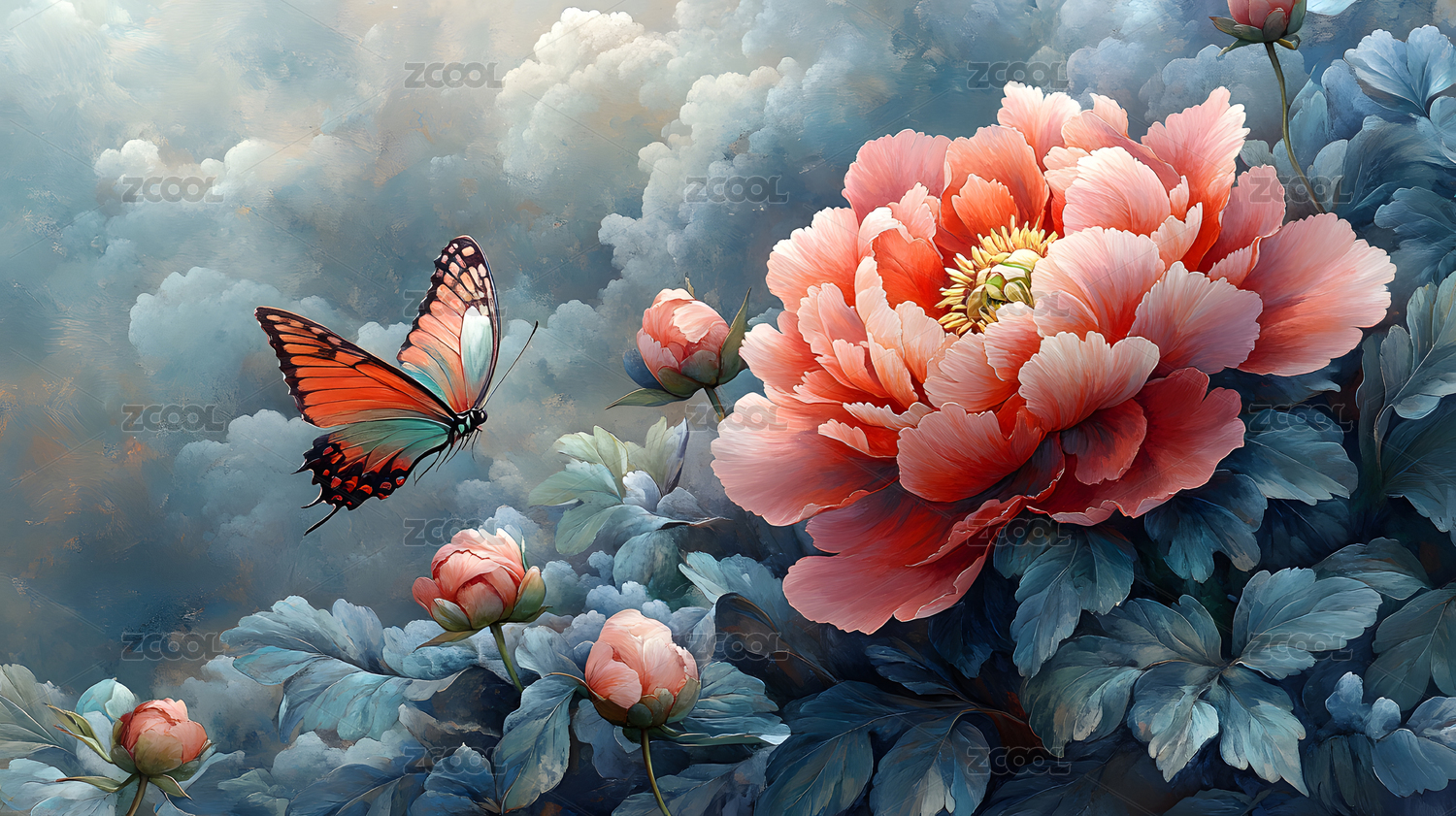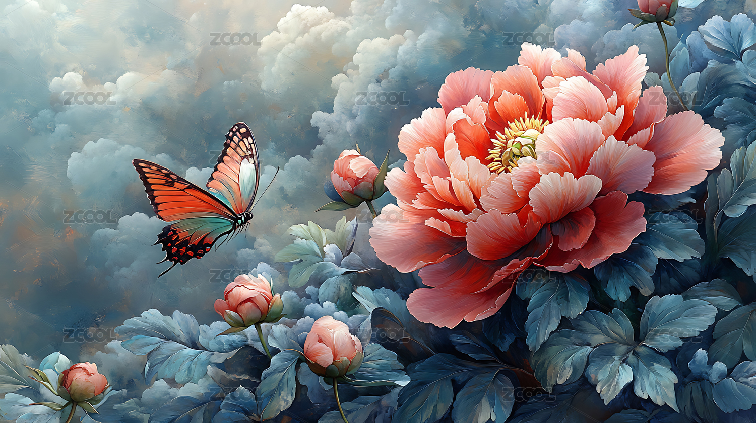 盛开的粉色牡丹花和一只飞翔的蝴蝶