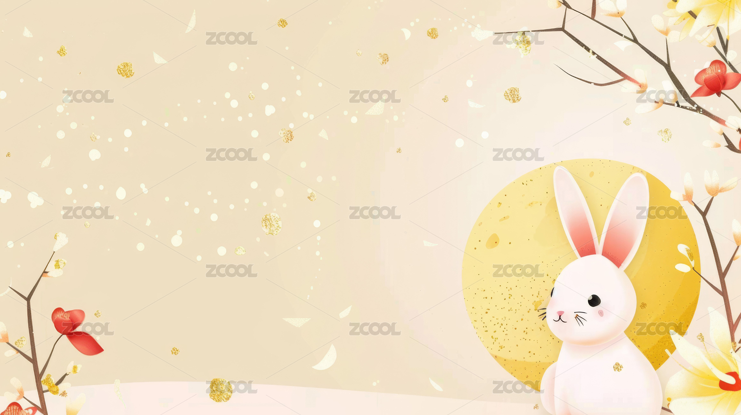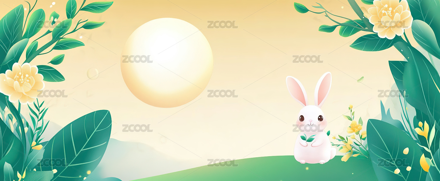 中秋节橙黄色调月亮玉兔桂花丝带飘带背景