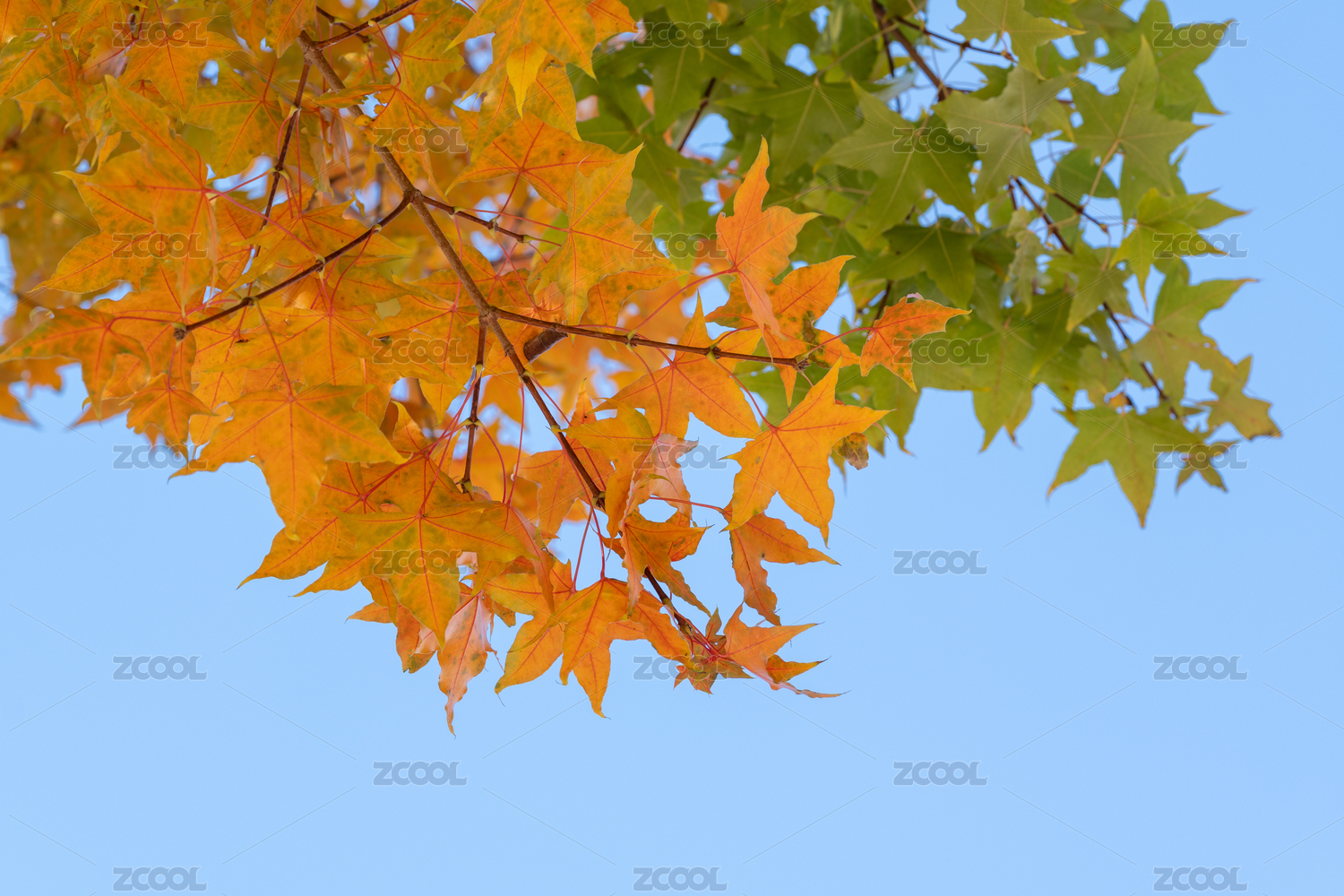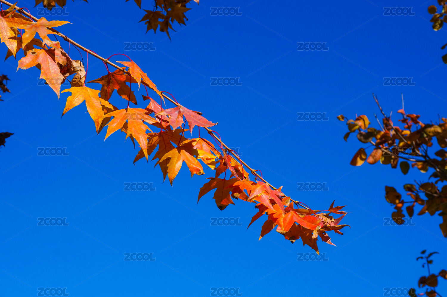 特写侧逆光条件中蓝天下一枝红枫树枝