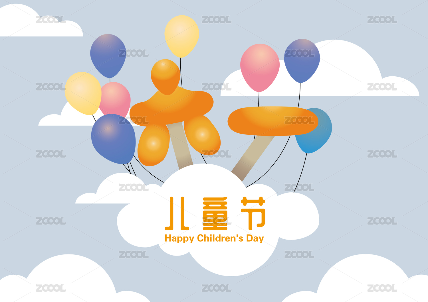 热气球上的一群儿童和儿童节手写字体