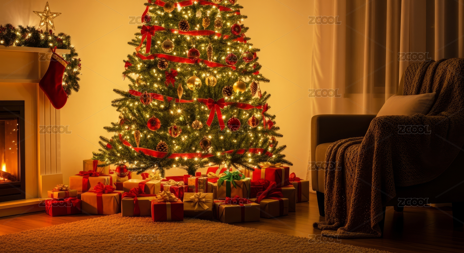 壁炉圣诞树礼物和长椅营造的温馨客厅