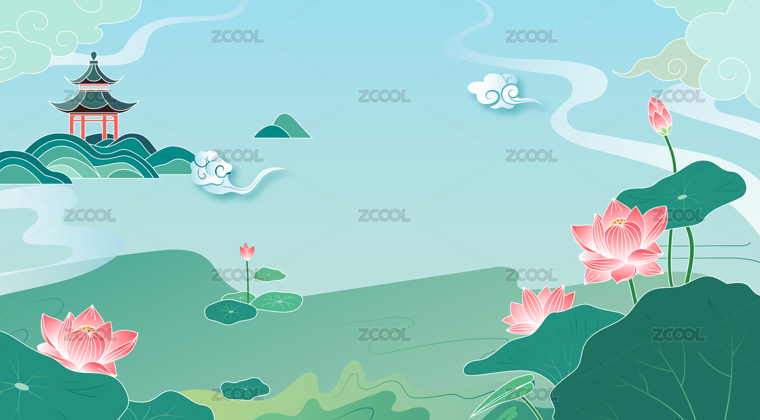中式山水荷花亭插画风景