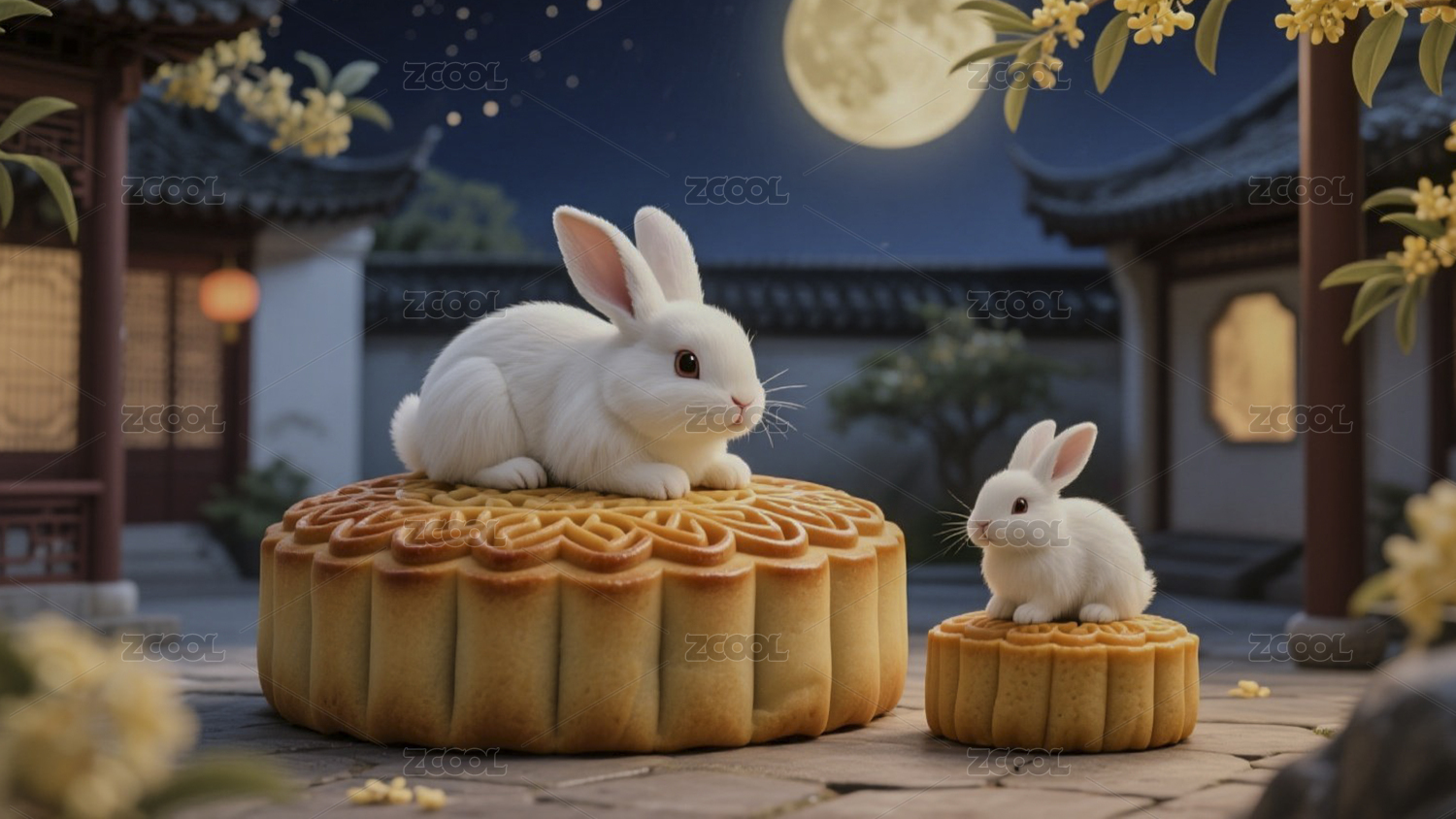 AIGC202403,3D,兔子,两只,白兔,中秋节,月饼,节日,背景,插画