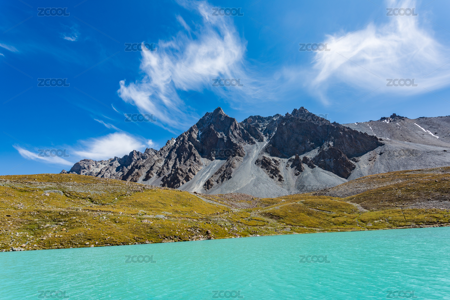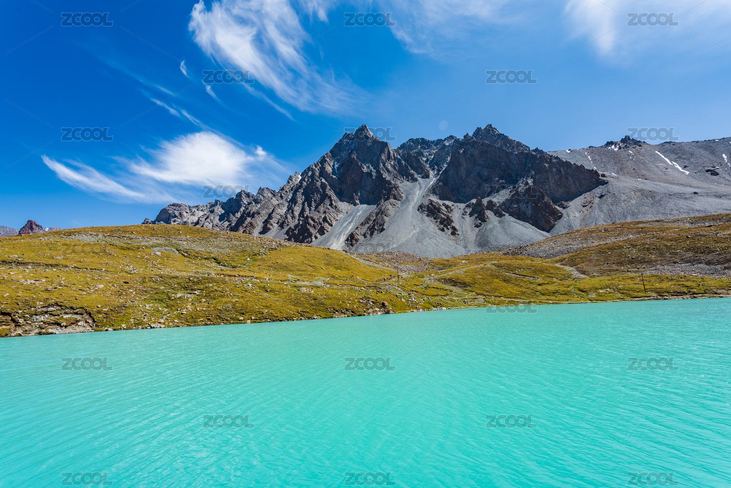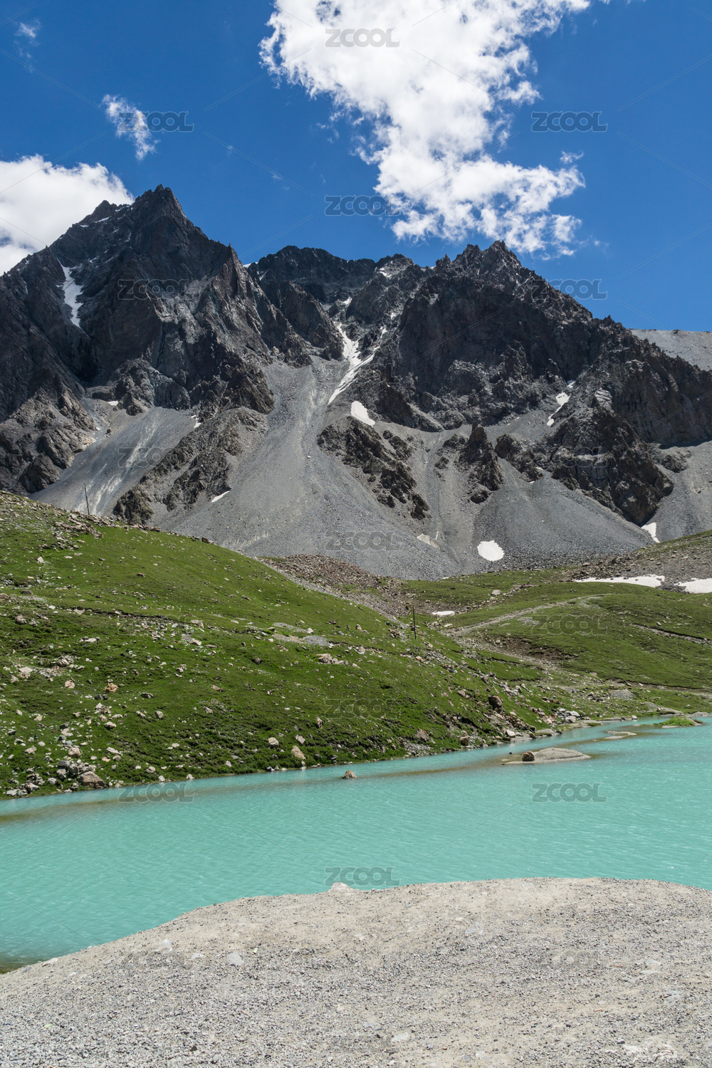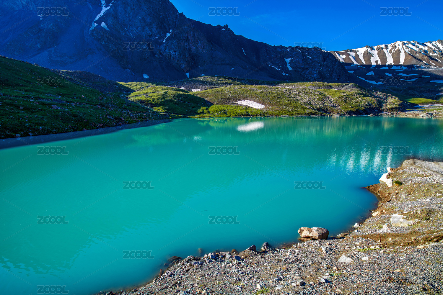 夏季中国新疆独库公路大小龙池雪山湖泊
