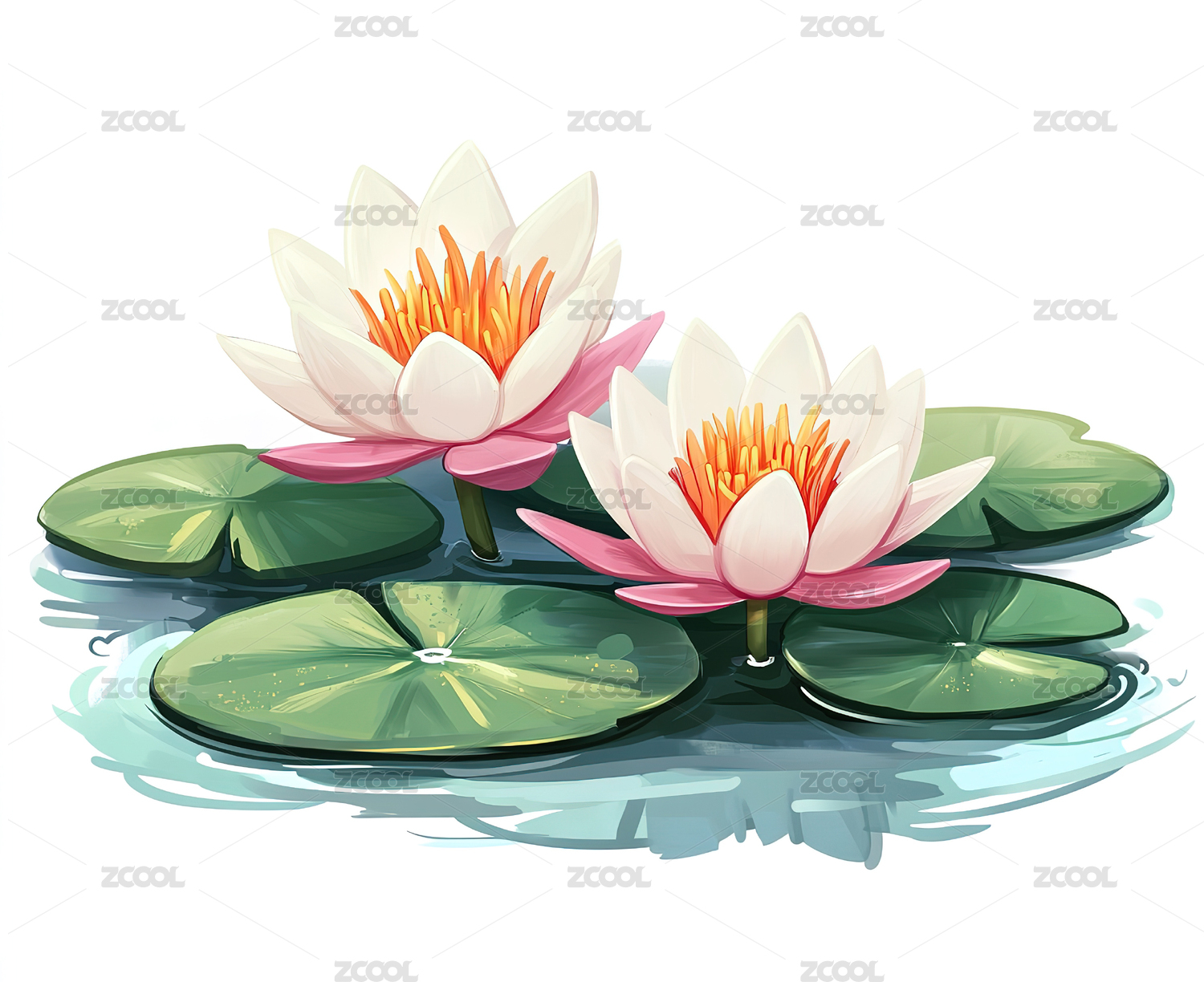 清新优雅的水莲花和绿色荷叶,在透明背景