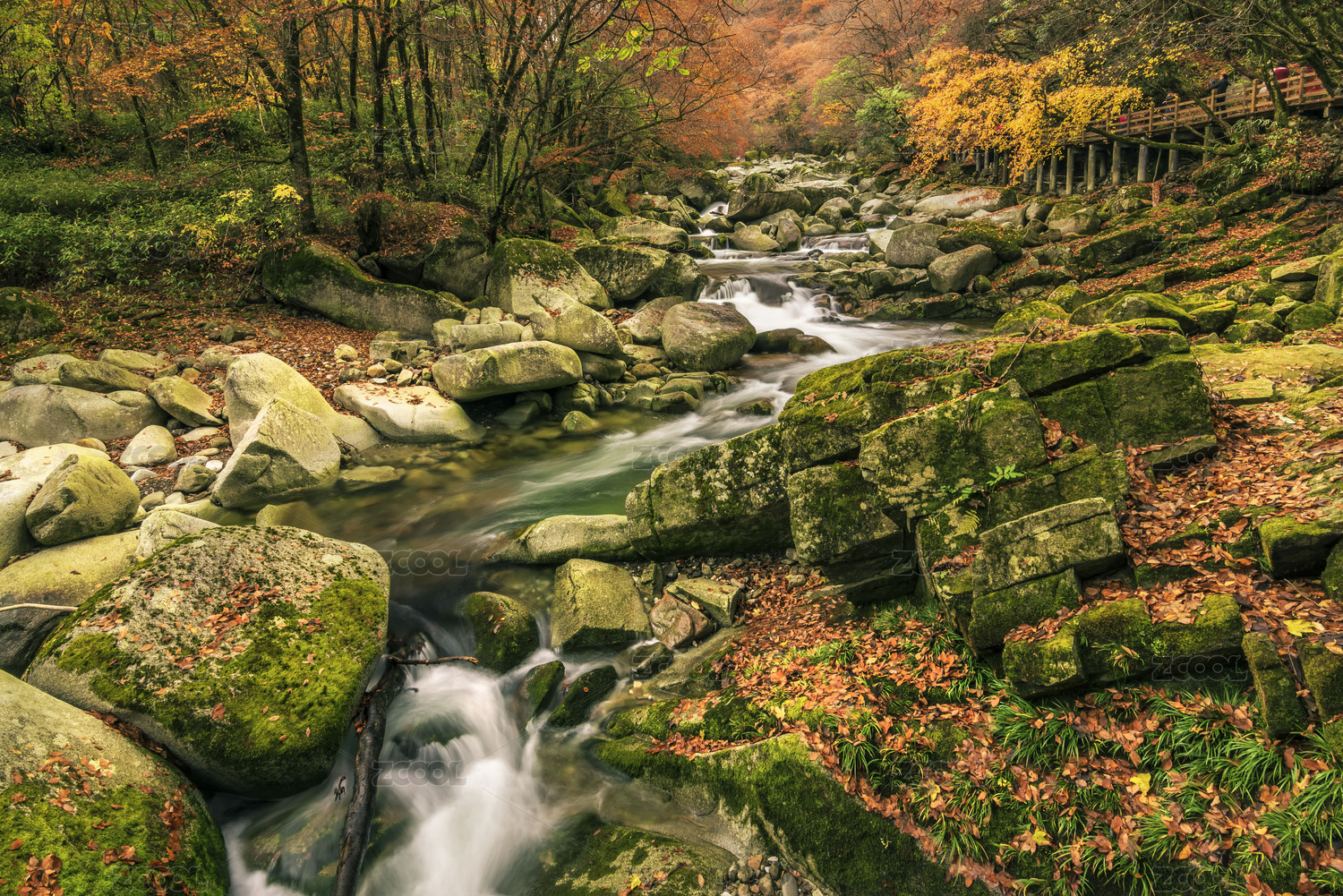 沈阳本溪老边沟,秋季石头溪流落叶自然风光