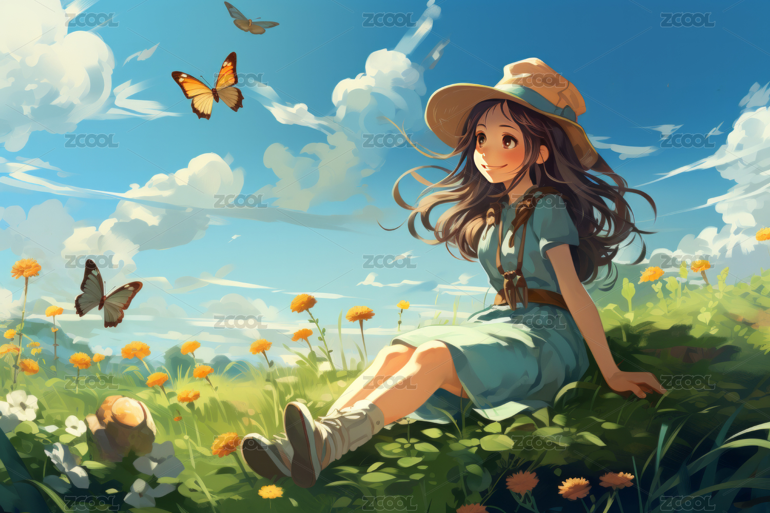 花海中的少女与蓝色花朵