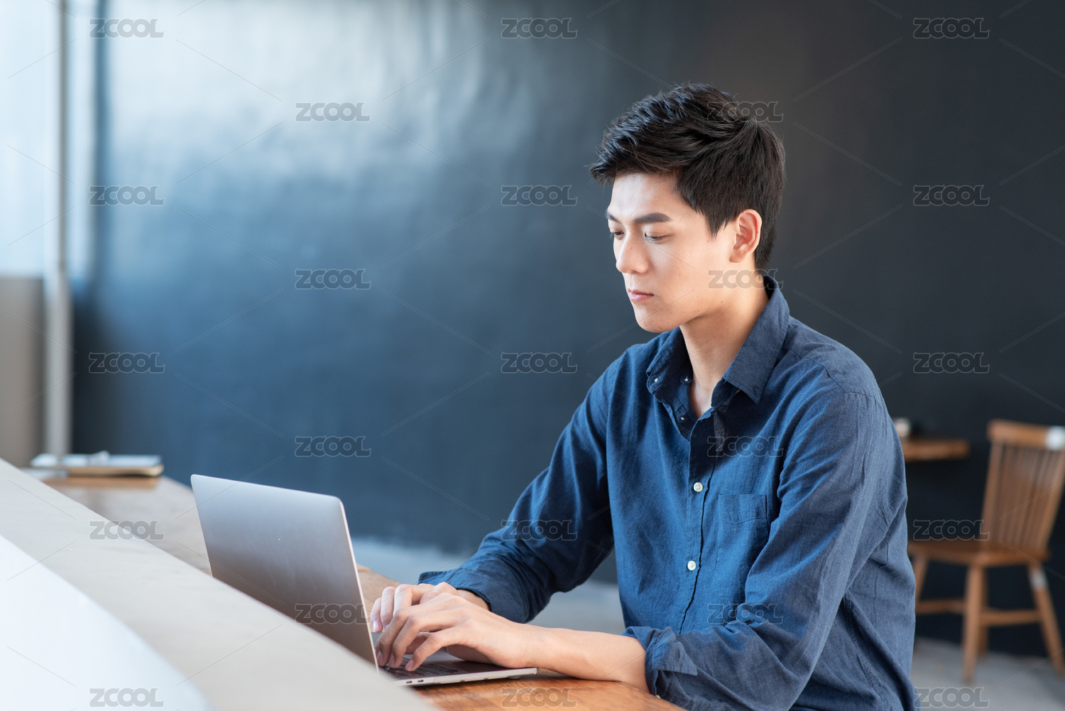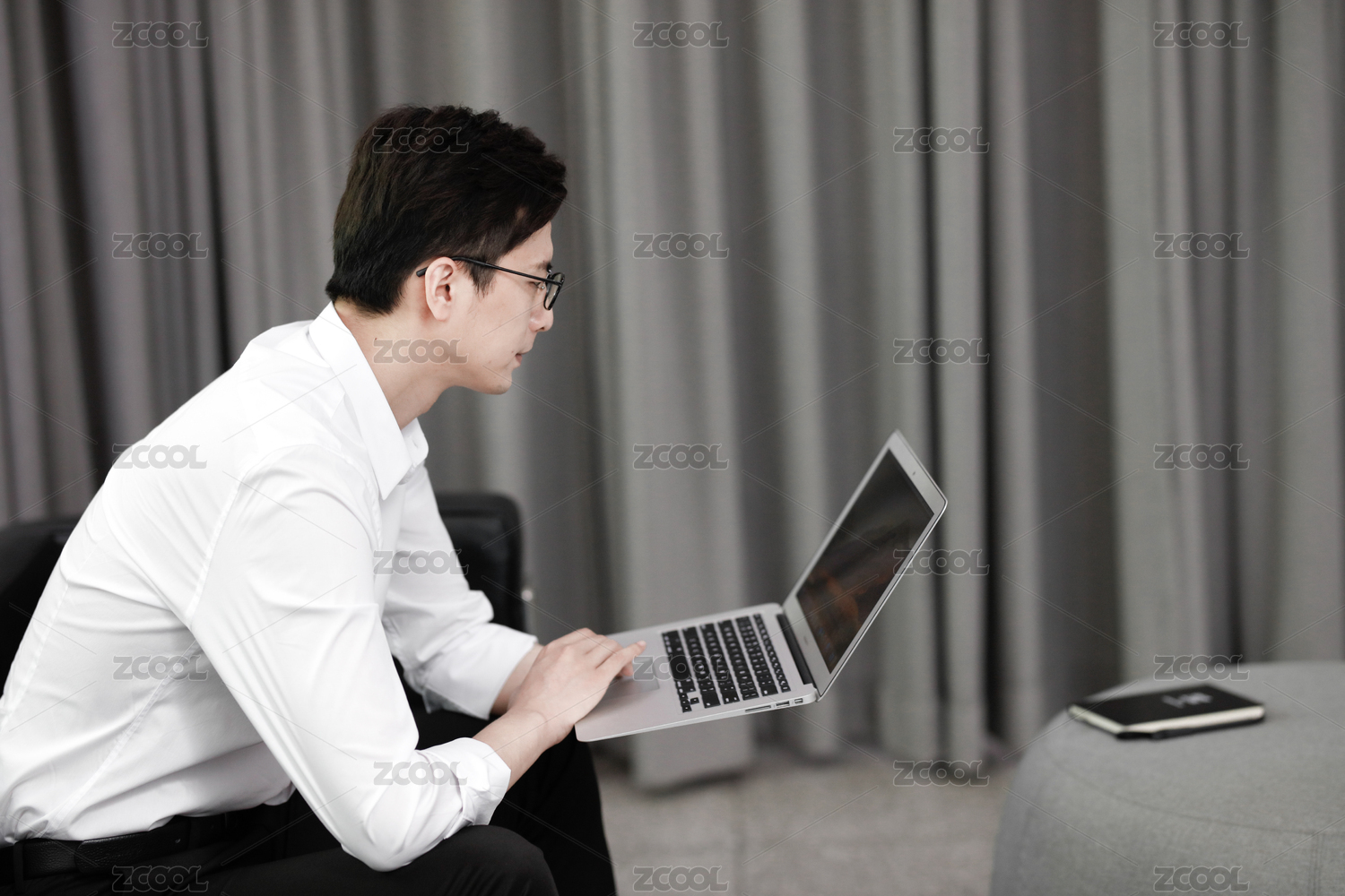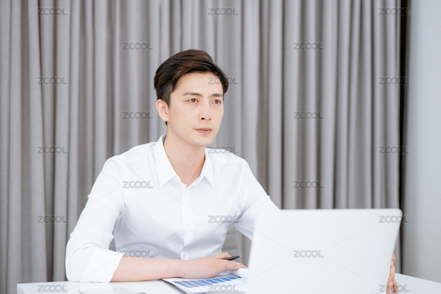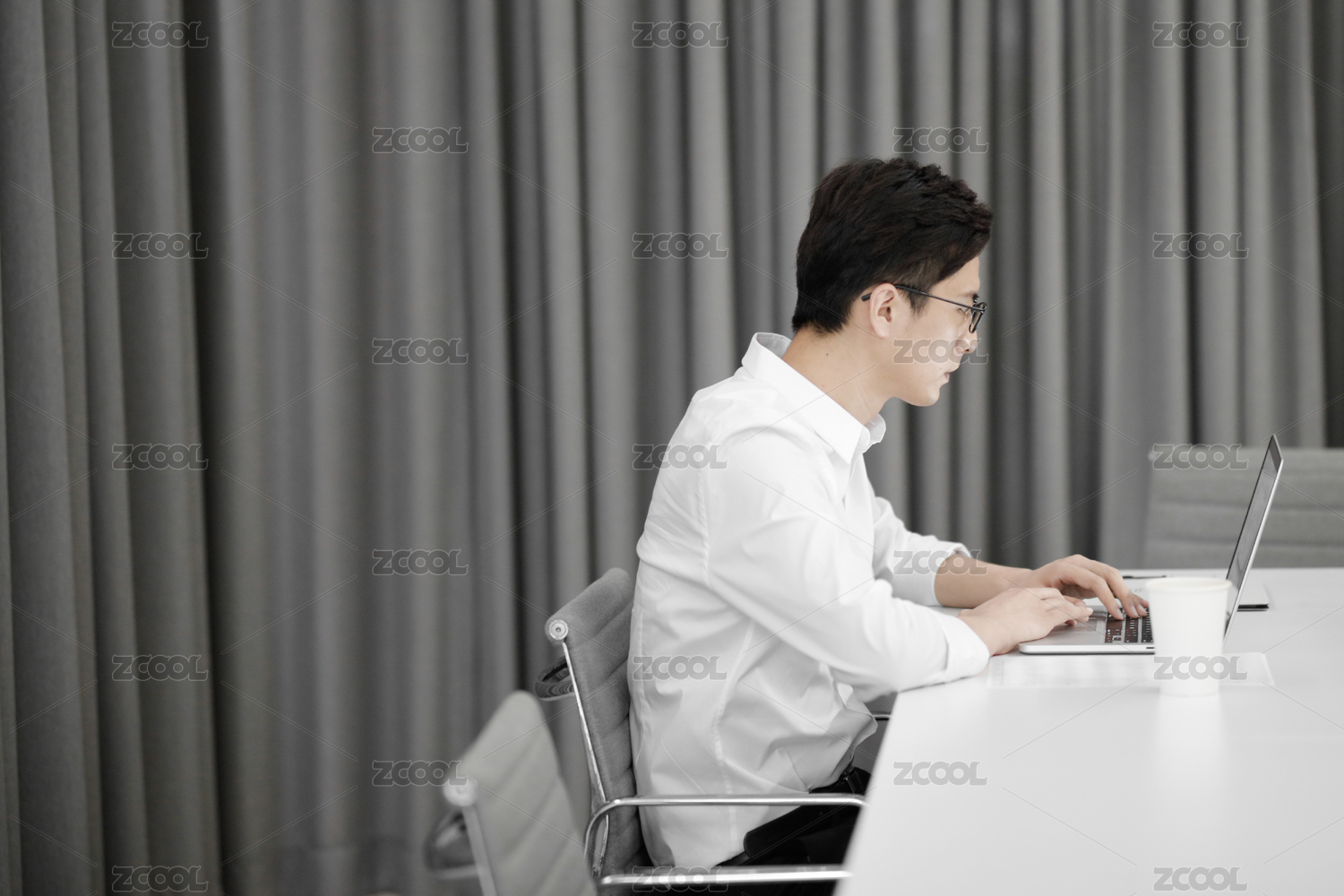 会议室里坐在笔记本电脑前目视前方的亚裔男子